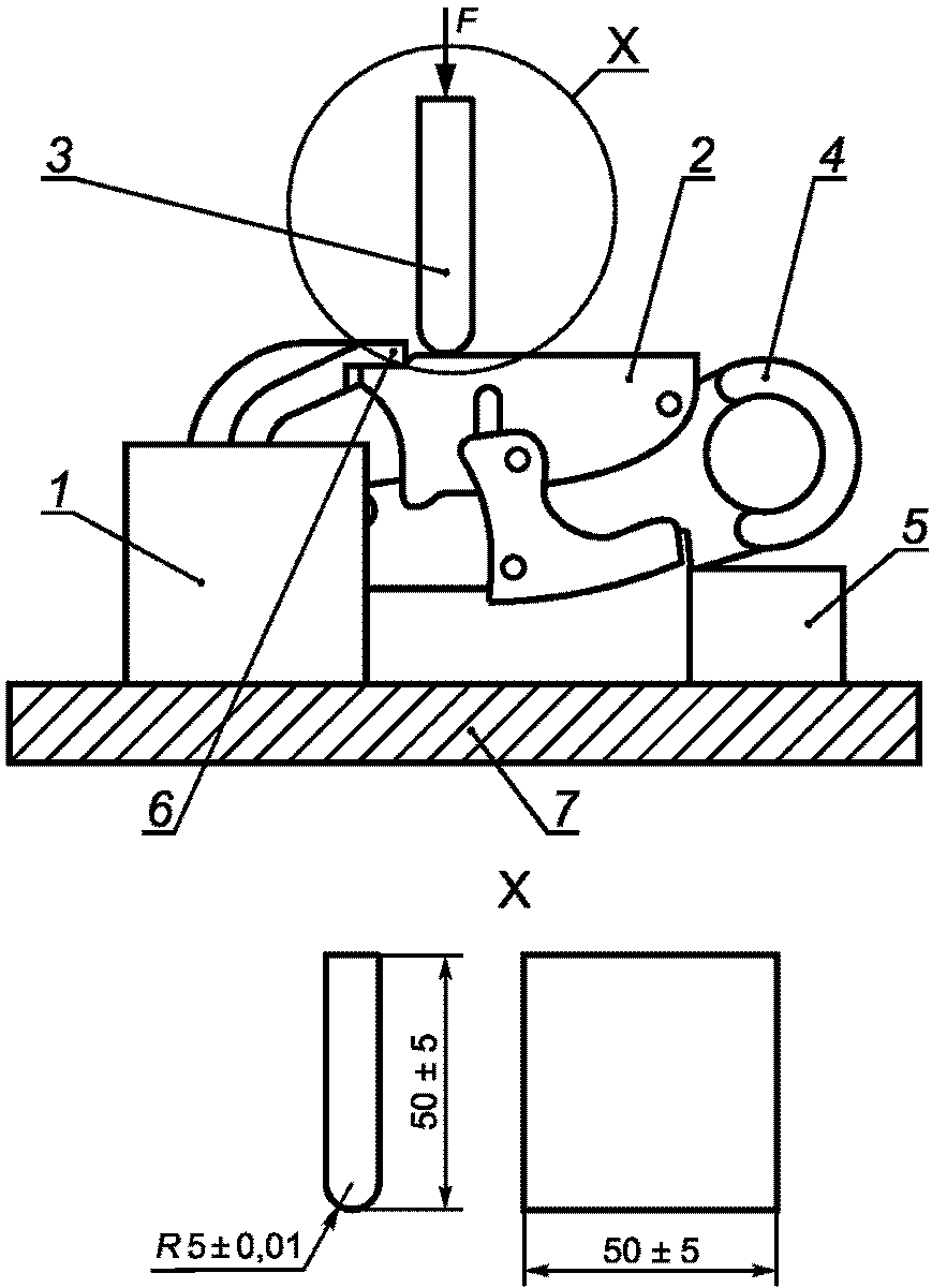 рисунок 7) прикладывают указанное усилие в течение (90 +/- 1) с к запорному элементу в точке, наиболее близкой к носовой части, насколько это возможно. Скорость нагружения должна быть от 50 до 150 Н/с. В случае, если это требуется в соответствии с