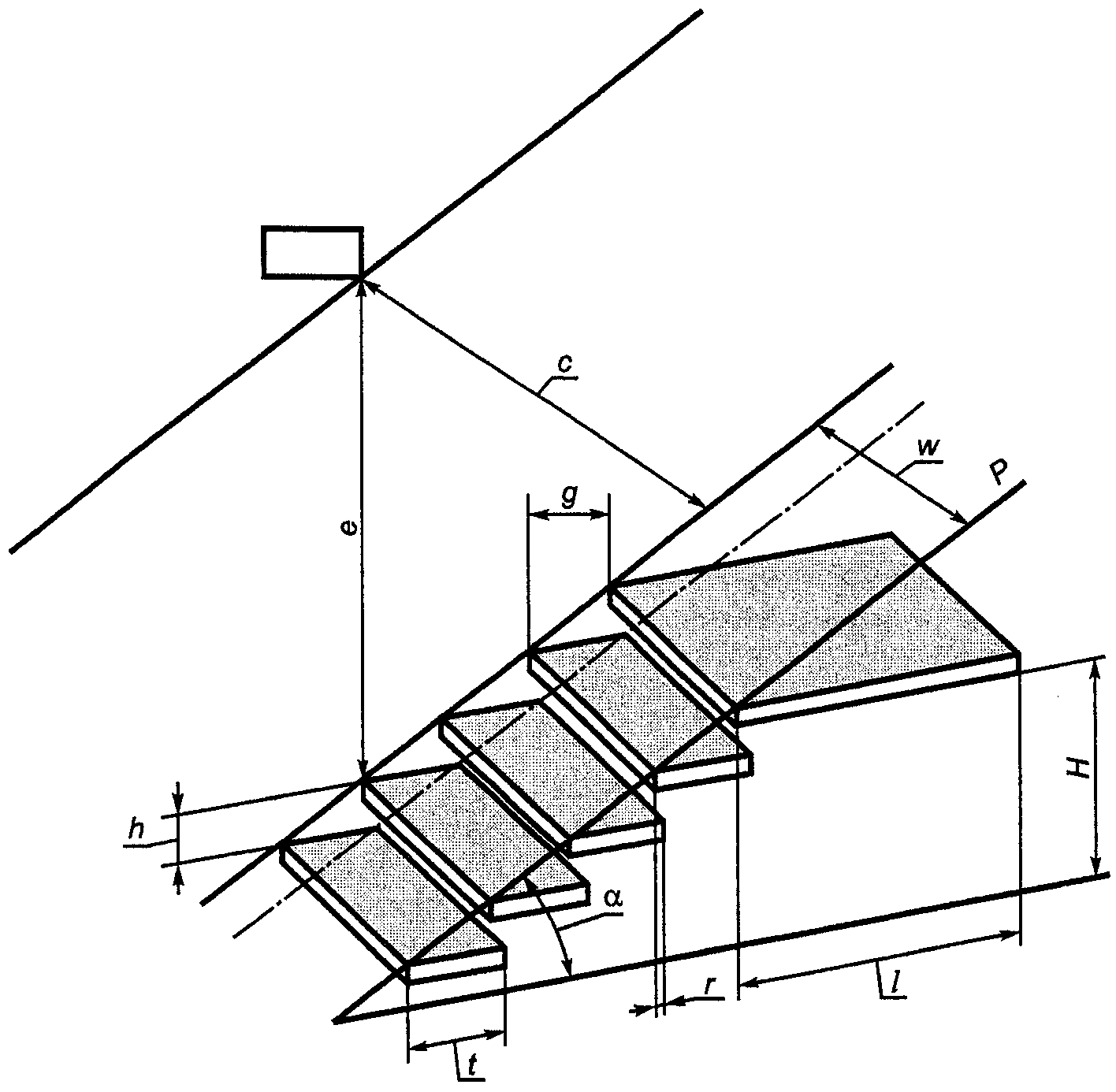 - угол наклона; w - ширина лестницы; P - осевая линия;