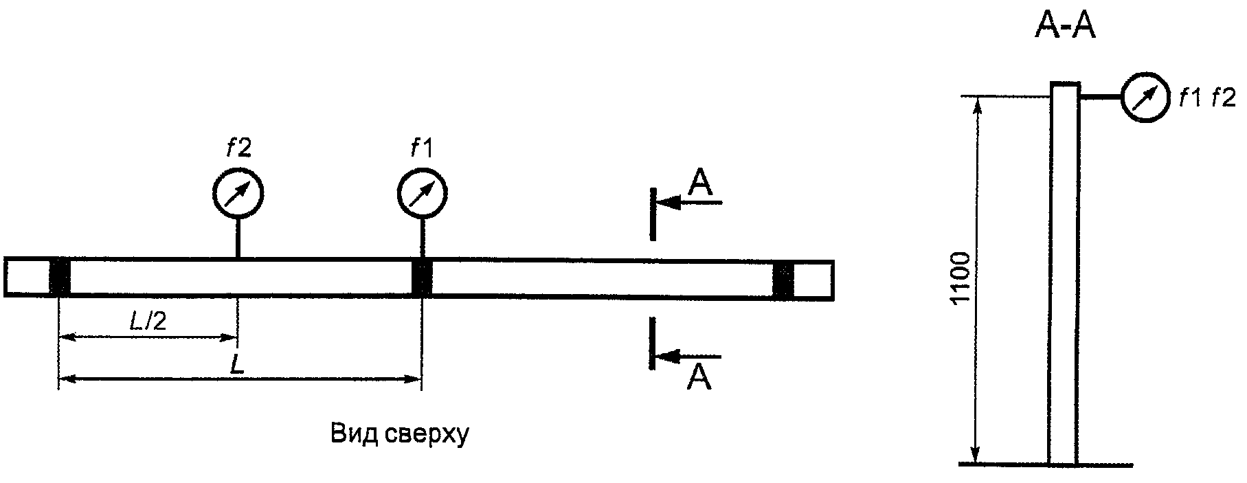 Деформации (f1 и f2) вдоль центральной линии следует определять с помощью прибора для измерения деформации (индикатора), расположенного горизонтально, как показано на