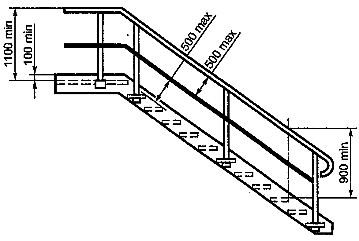 7.2.2. Перила следует применять, когда высота подъема превышает 500 мм и когда необходимо обеспечить защиту лестницы сбоку, если боковое пространство между тетивой лестницы и, например, стеной, больше 200 мм.