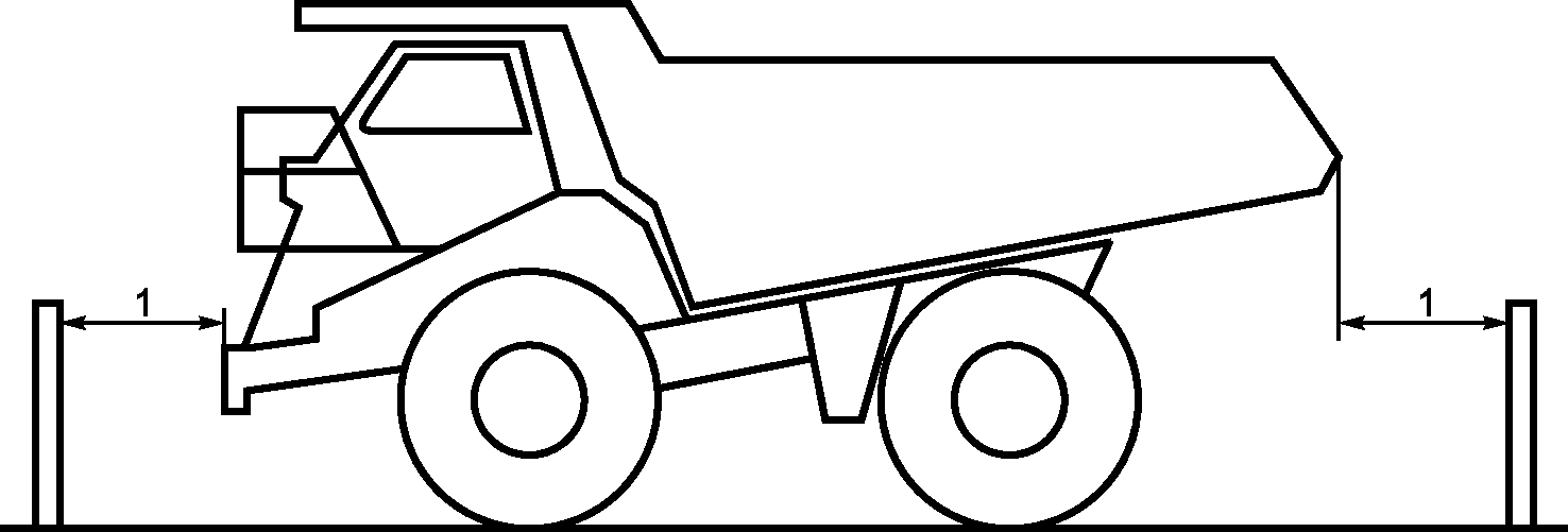Ковш погрузчика в транспортном положении - HH = (300 +/- 50) мм. Наименьший прямоугольный контур вокруг машины с ковшом погрузчика в транспортном положении (как при симметричном расположении, так и при сдвиге в сторону) определяют на расстоянии 1 м от габаритного контура.