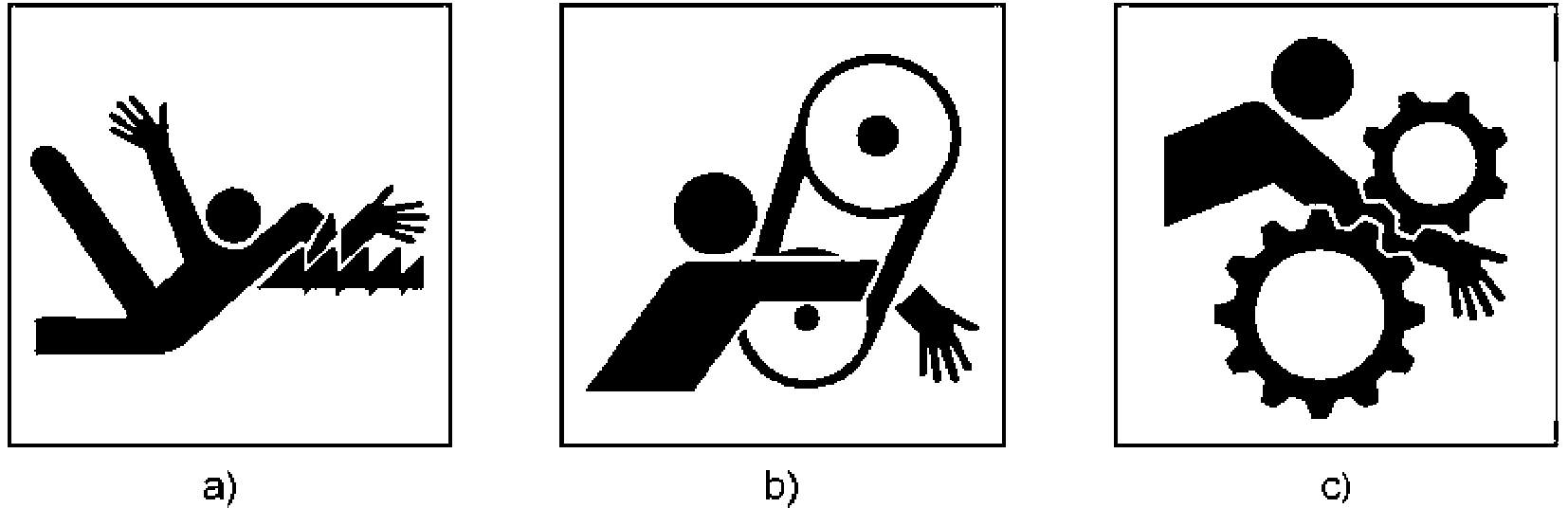 На рисунке D.15 приведены примеры иллюстраций, в которых показаны отдельные опасные узлы машины не в контексте их расположения на машине, а в соответствии с графическим представлением опасности.