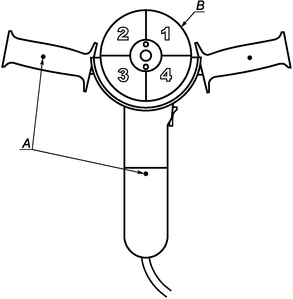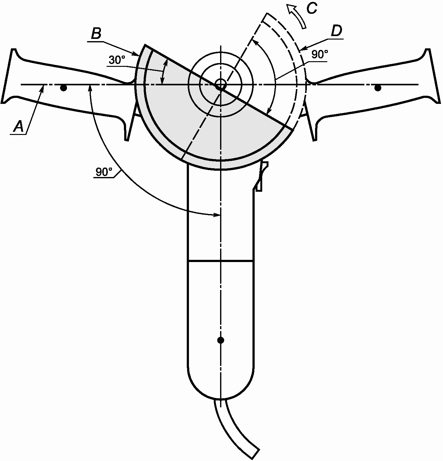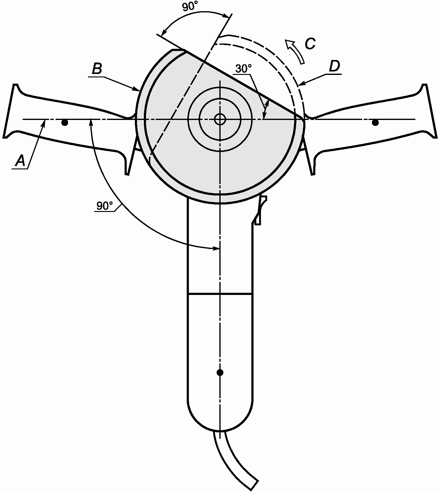3.104.1. Угловая шлифовальная машина (angle grinder): машина с вращающимся шпинделем, расположенным под прямым углом относительно оси вала электродвигателя, предназначенная для радиального и торцевого шлифования.