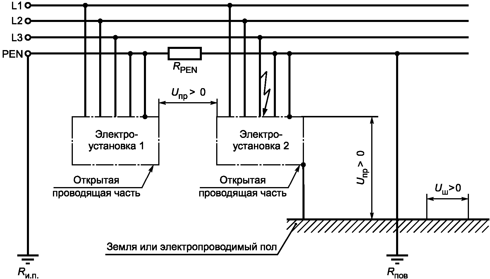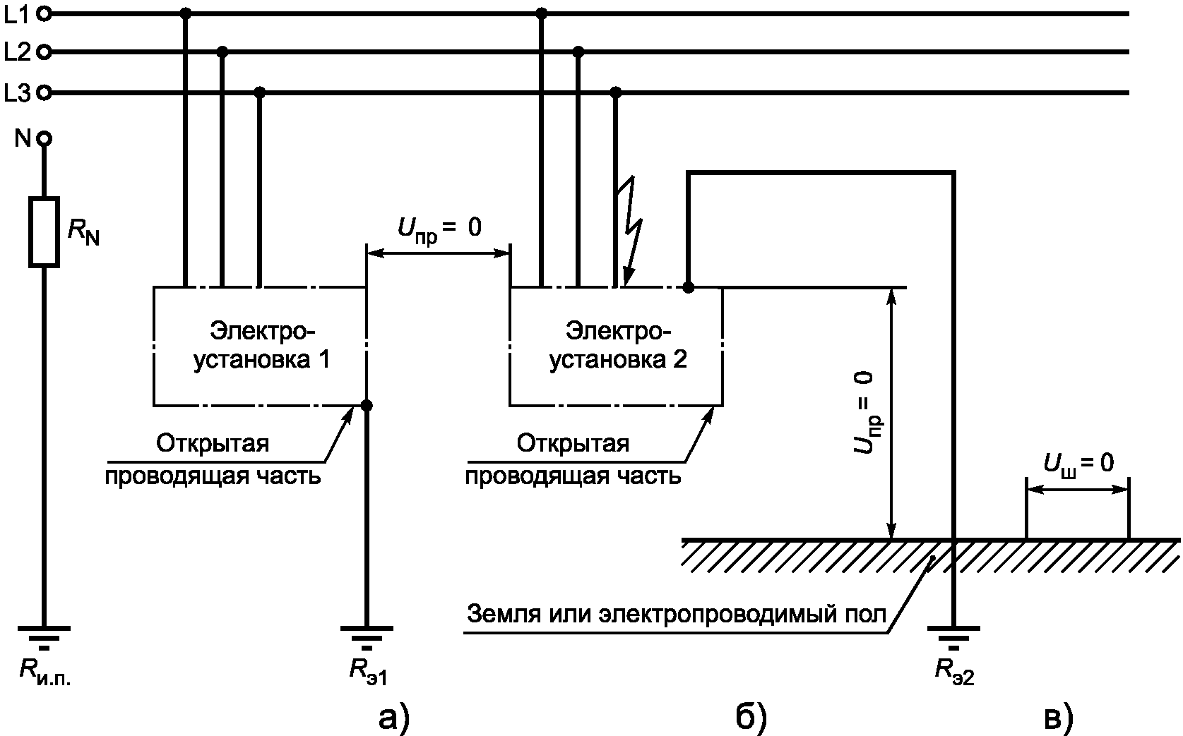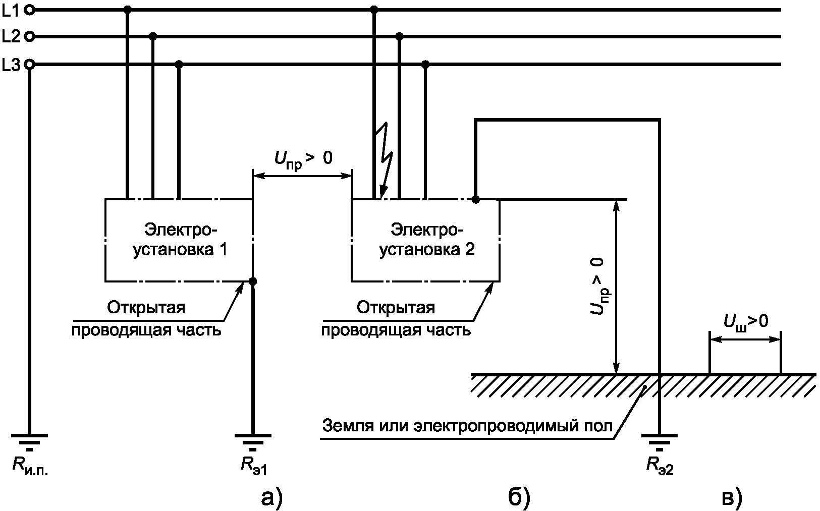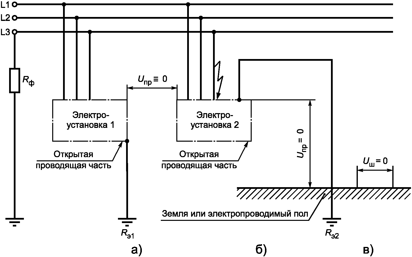 │открытой проводящей частью и находящимися в земле или проводящем полу│