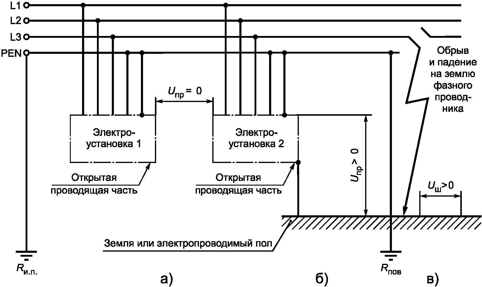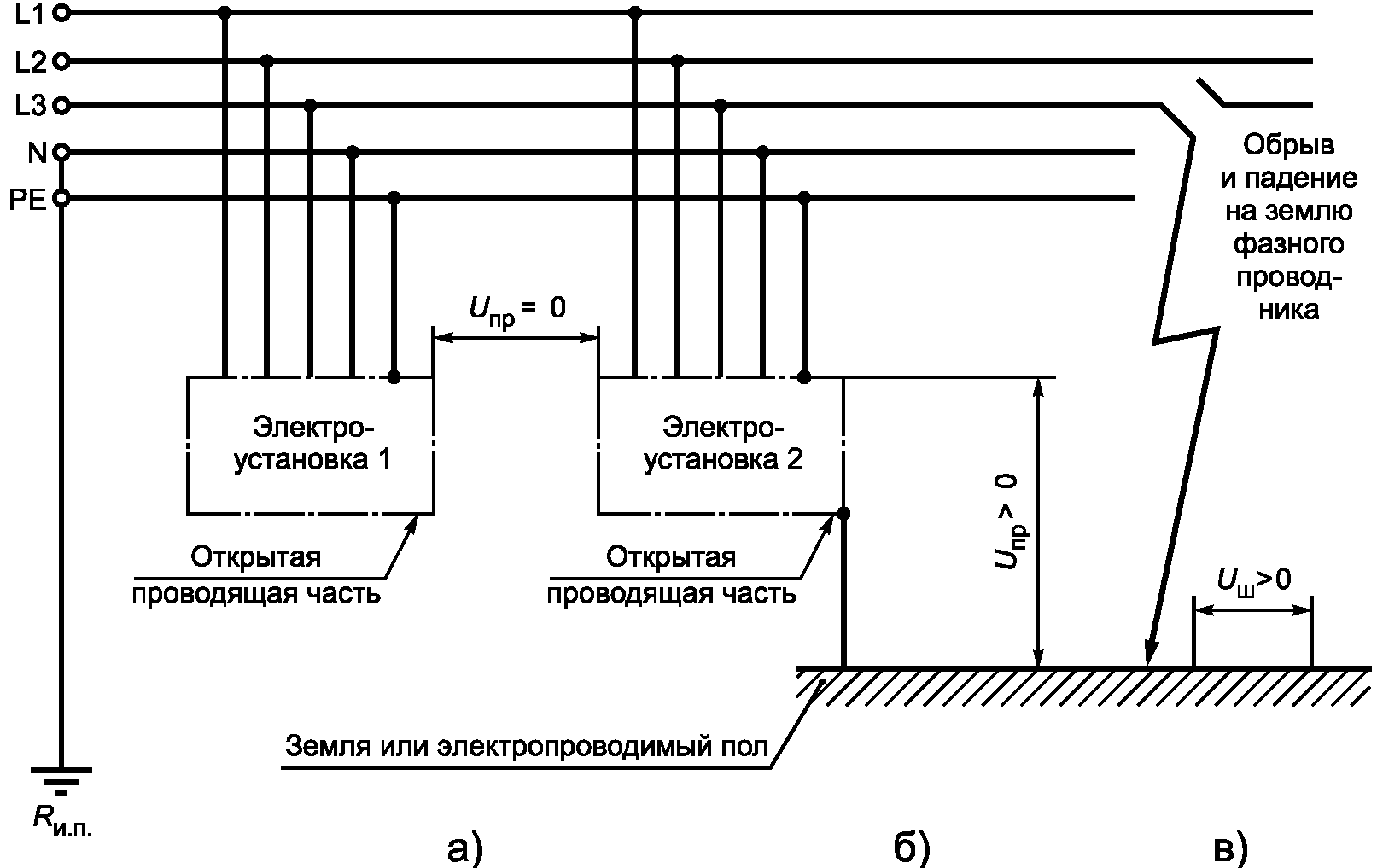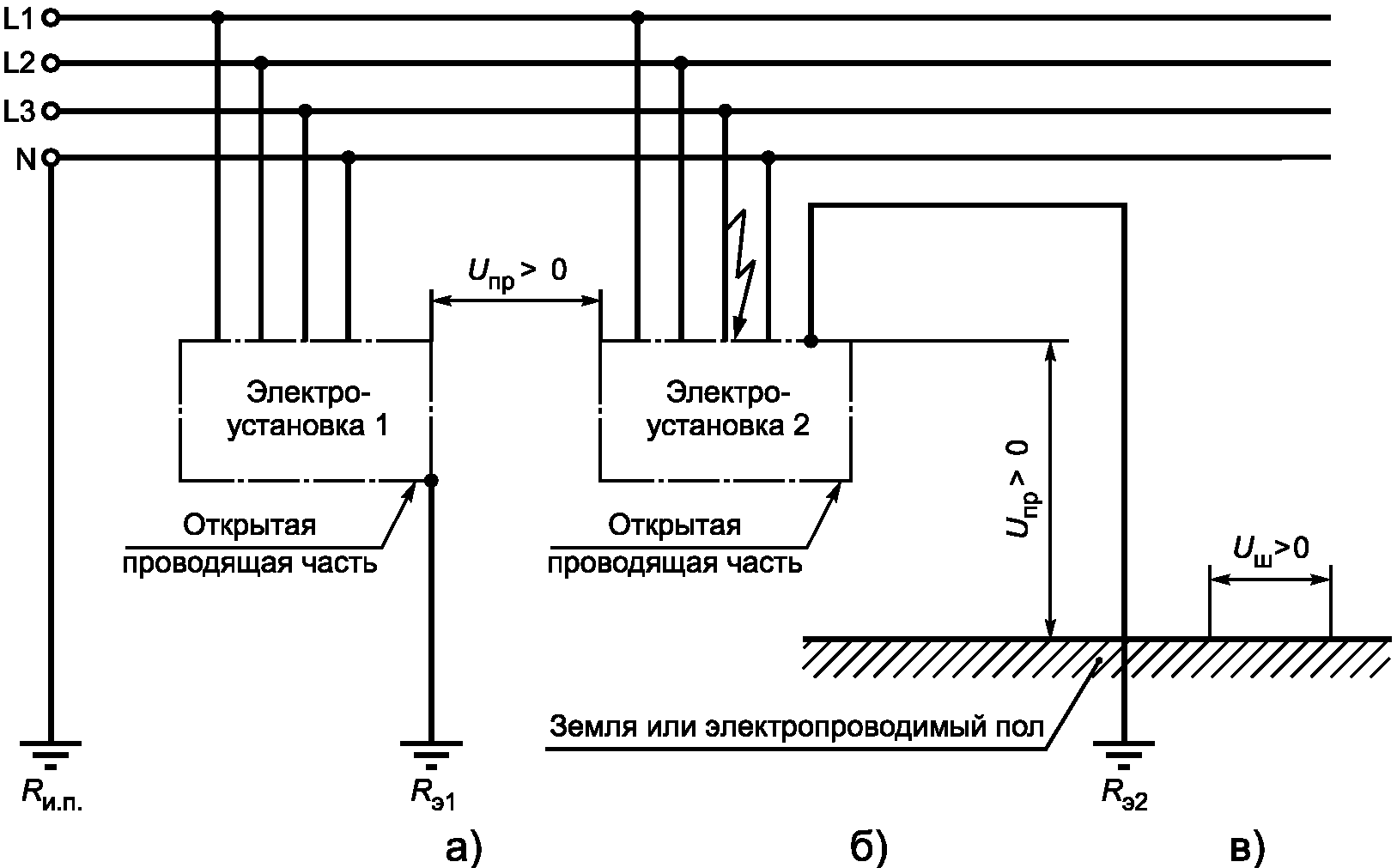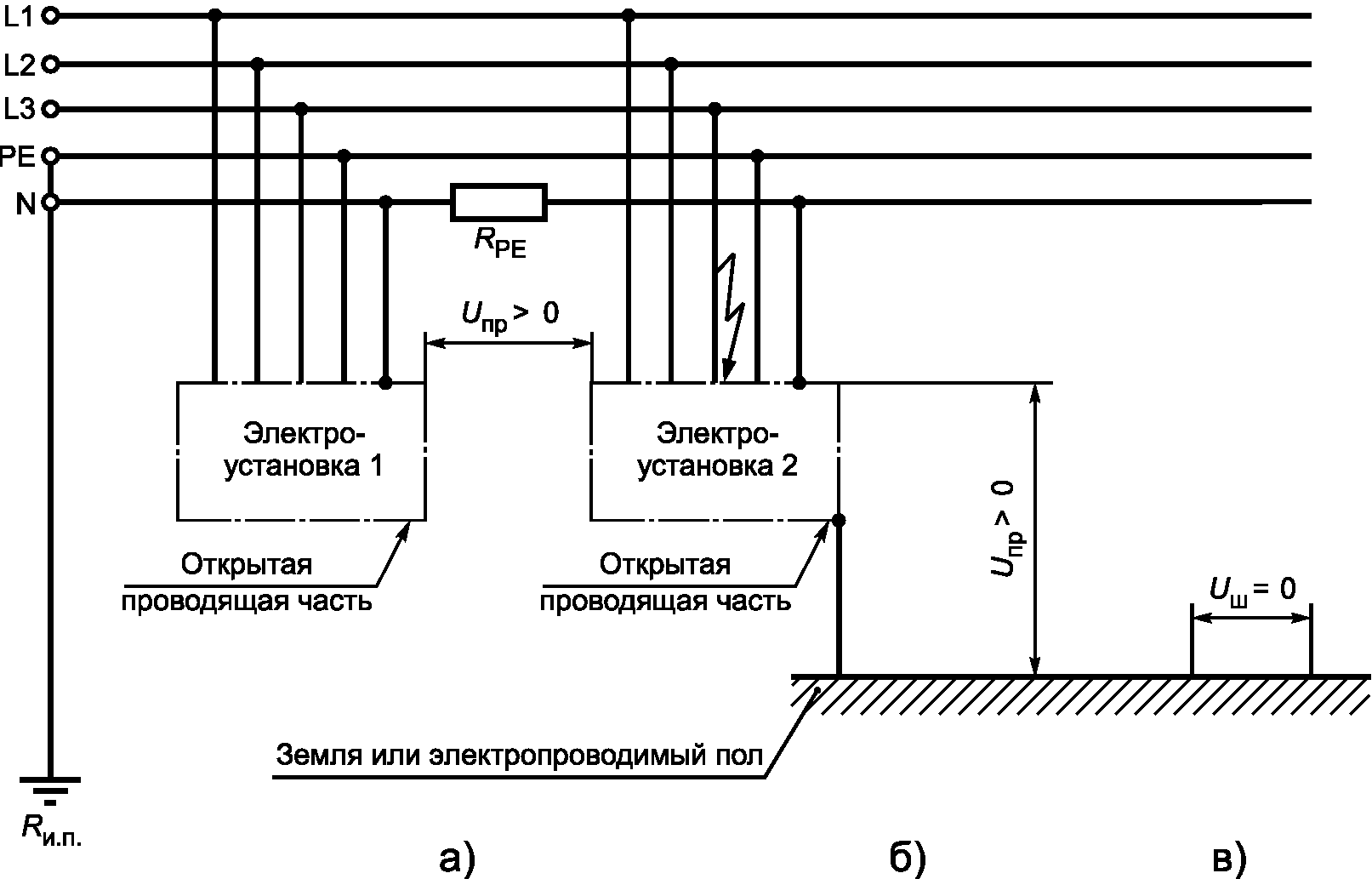 │открытой проводящей частью и находящимися в земле или проводящем полу│