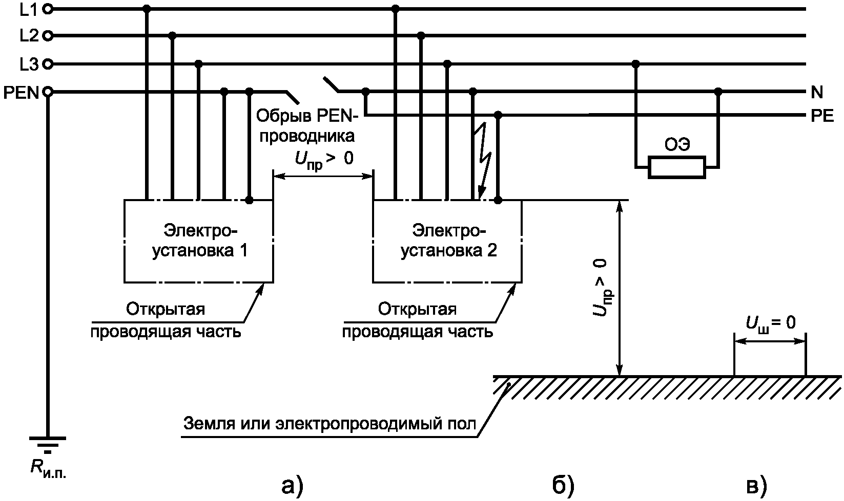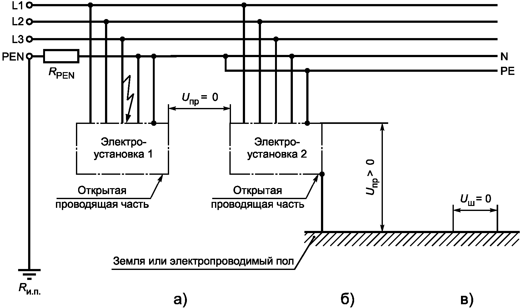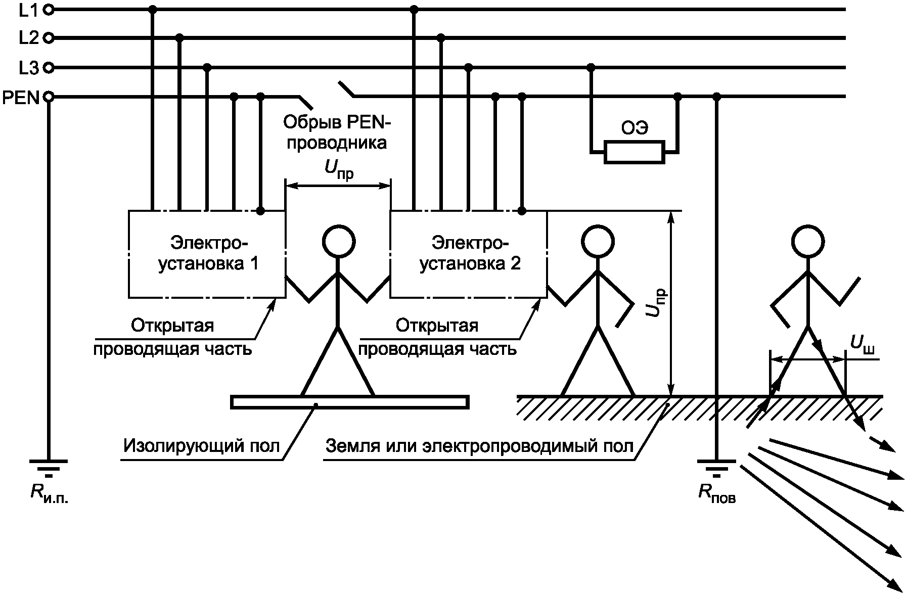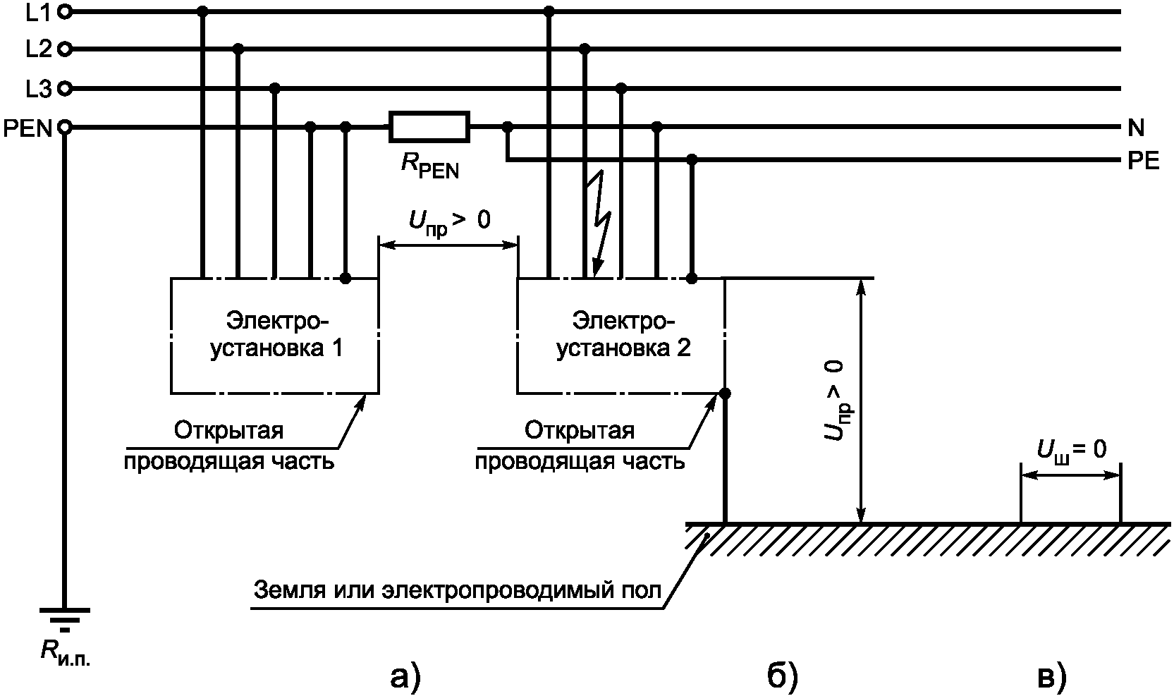 │открытой проводящей частью и находящимися в земле или проводящем полу│