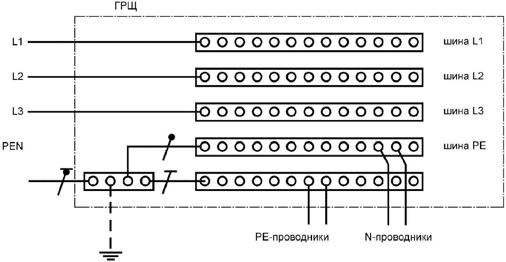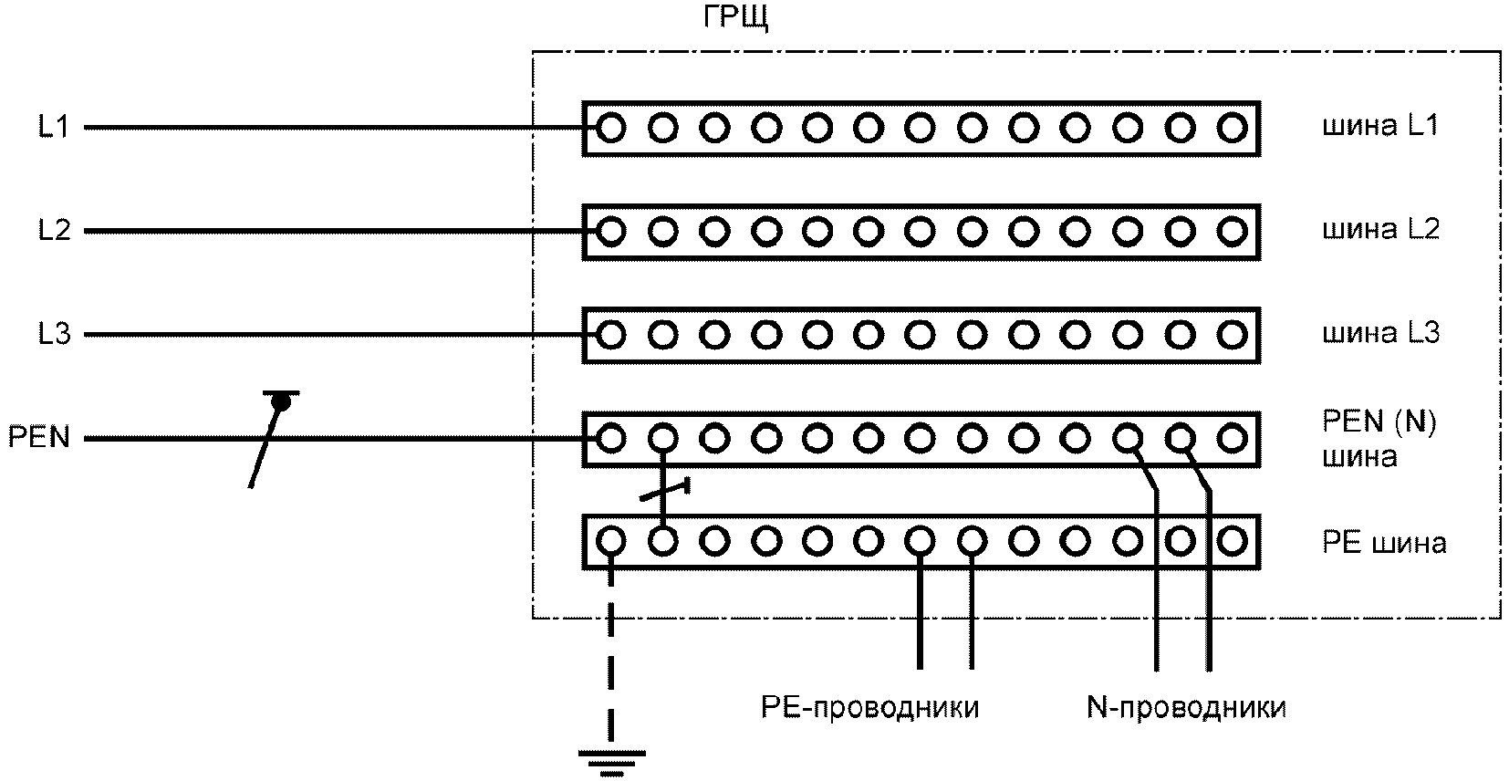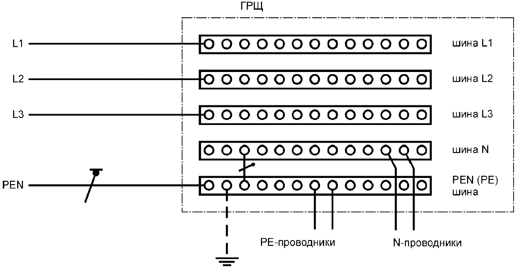 541.3.9. Главный заземляющий зажим (шина) (main earthing terminal): зажим (шина), являющийся(аяся) частью заземляющего устройства установки и обеспечивающий(ая) присоединение нескольких проводников с целью заземления.