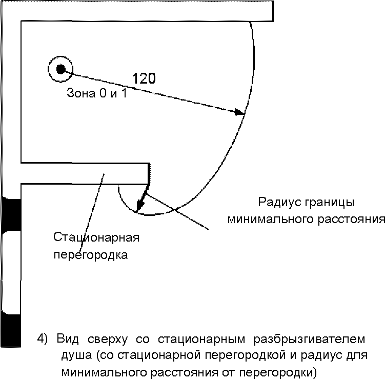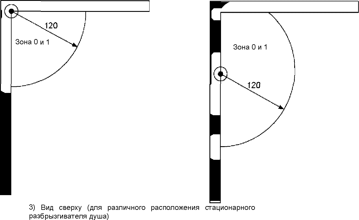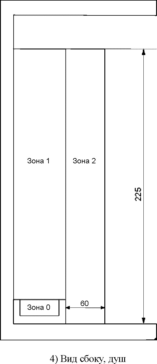 Для душей без поддона высота зоны 0 составляет 10 см, и над ее поверхностью присутствует зона 1, как и по горизонтали, см.