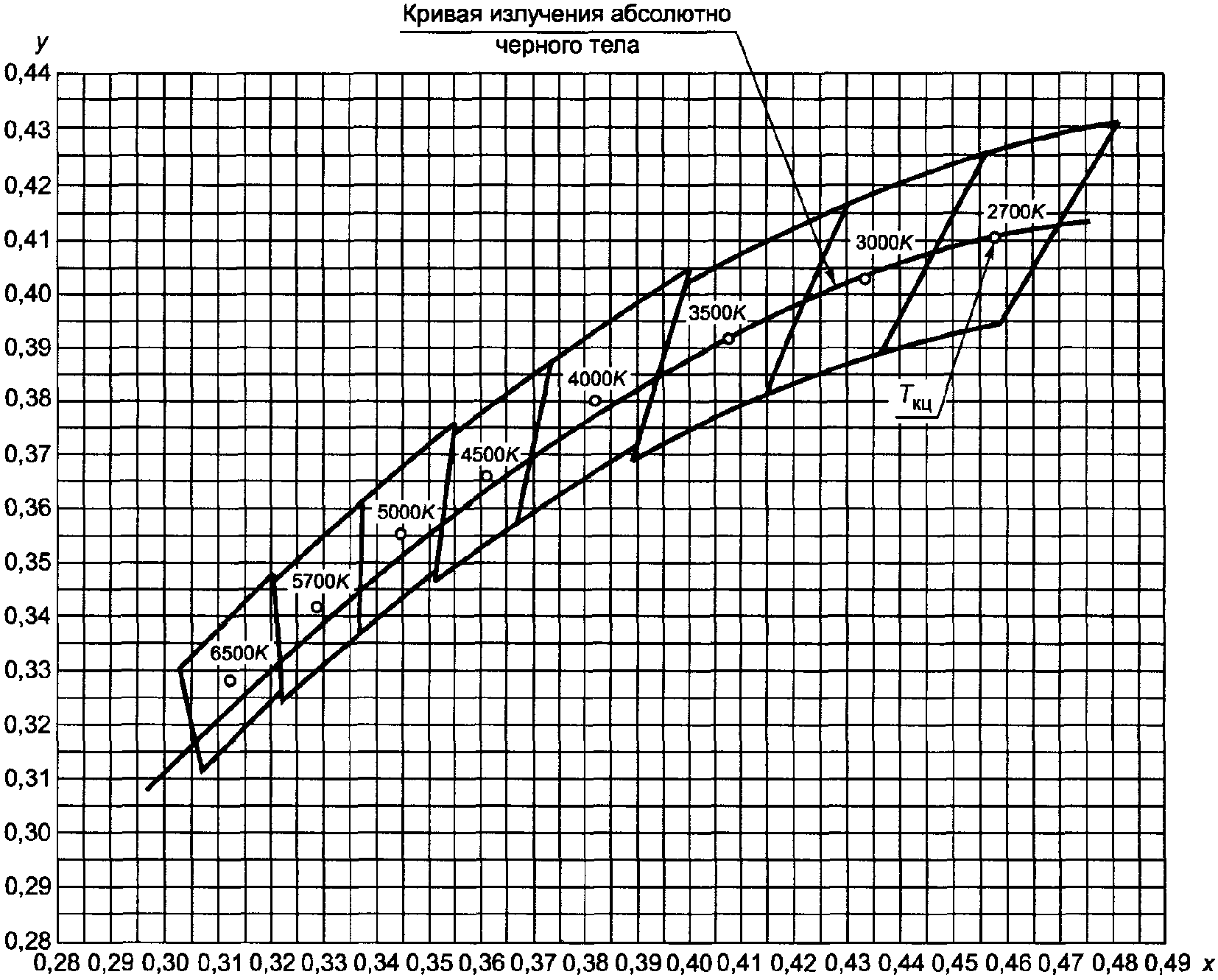 Примечание - Цветовая температура ИС определяется точкой, соответствующей его цветности на линии черного тела, нанесенной на цветовом графике международной комиссии по освещению (МКО).