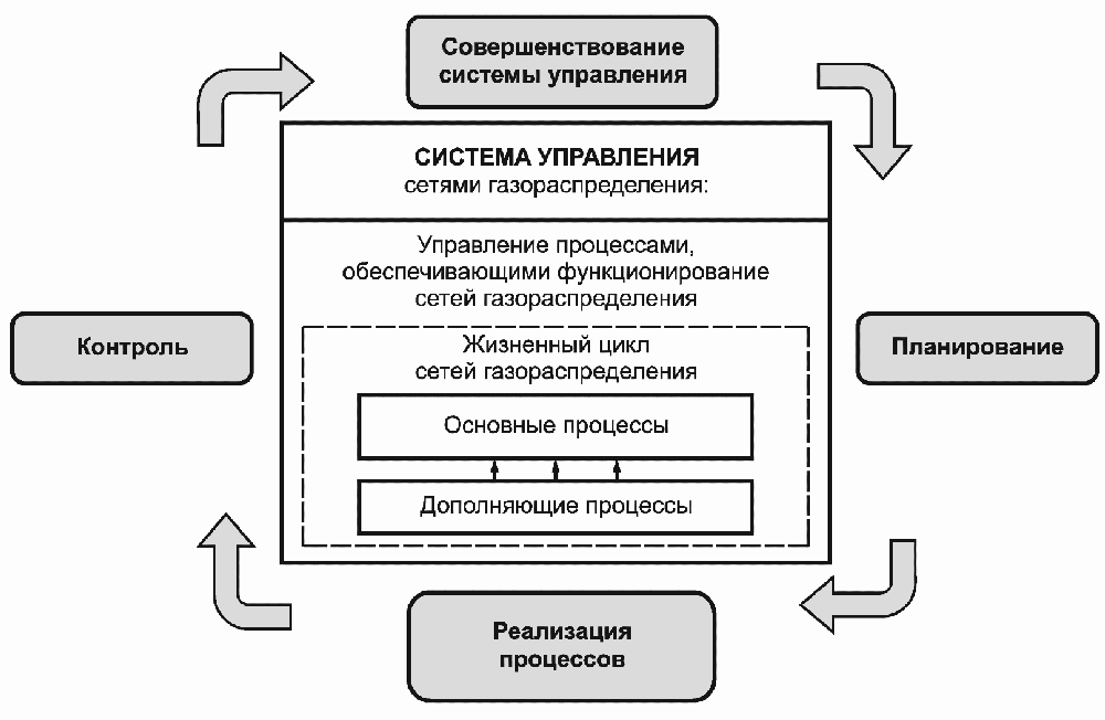 3.2. система управления сетями газораспределения: Комплекс организационно-технических мероприятий, реализуемых на всех стадиях жизненного цикла сети газораспределения, по обеспечению функционирования сети газораспределения в соответствии с нормативными и договорными требованиями, а также в соответствии с целями и задачами организации.