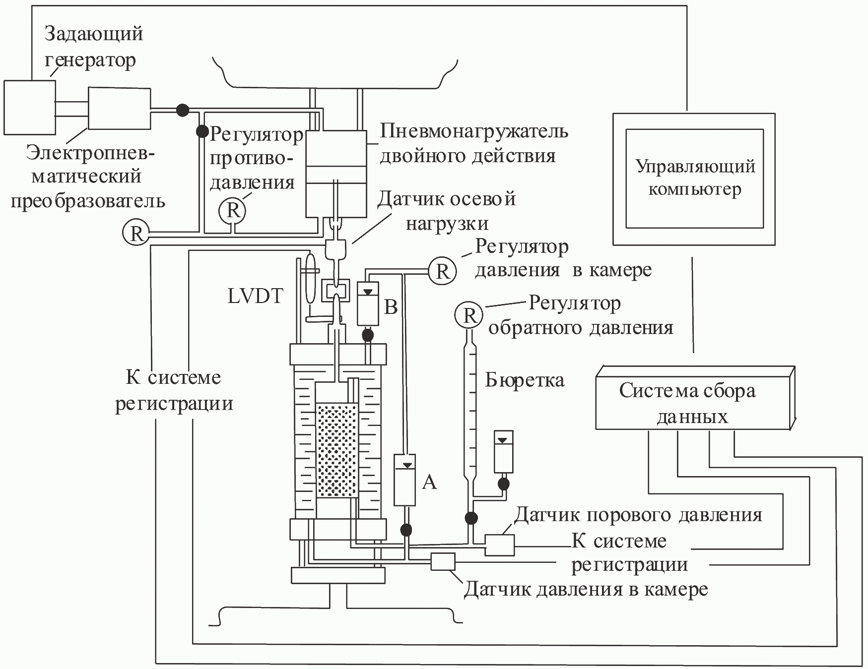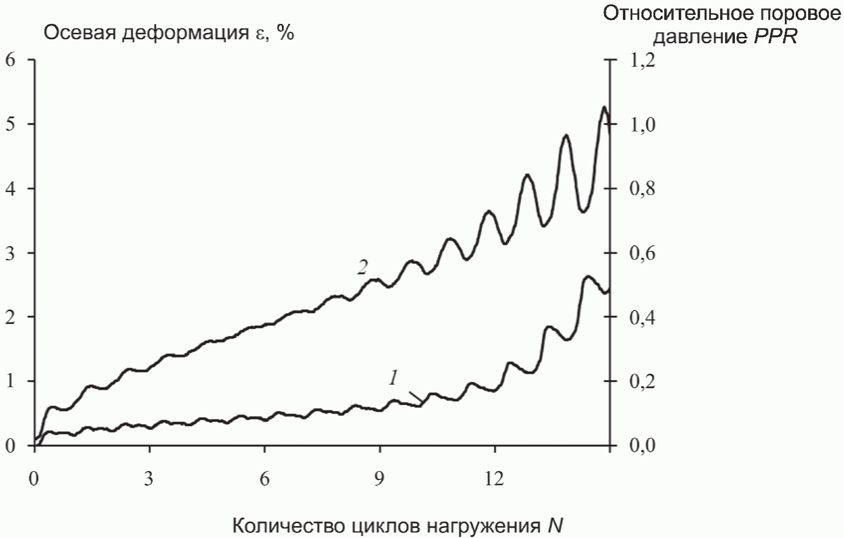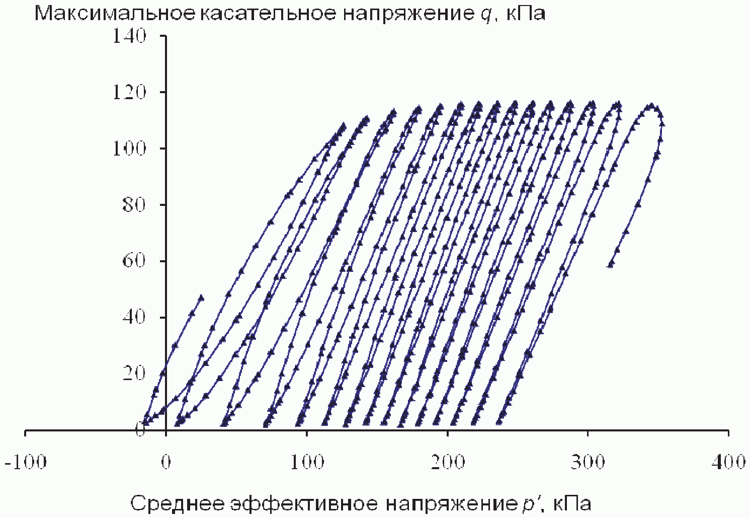 после циклического воздействия и решается экспериментально путем реконсолидации образца в дренированных условиях по окончании динамического трехосного сжатия при сжимающих напряжениях, соответствующих условиям естественного залегания.