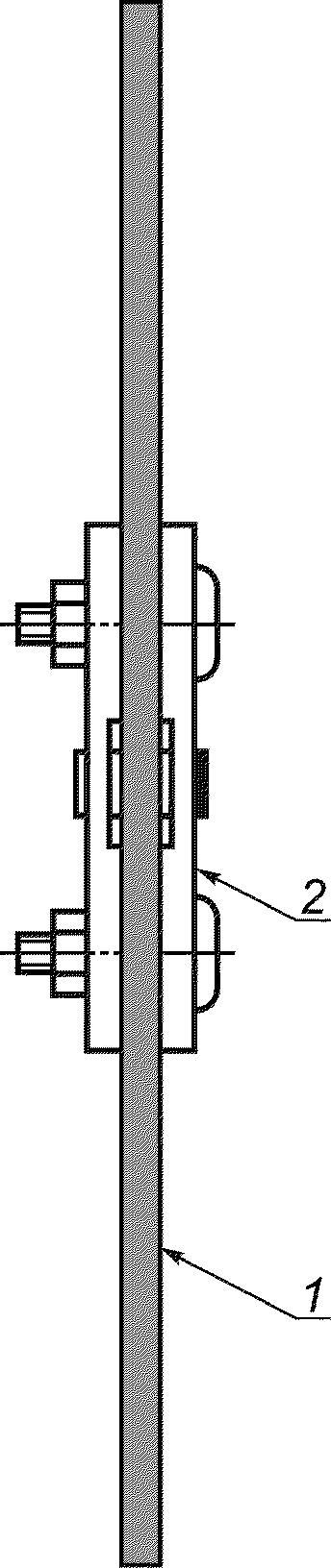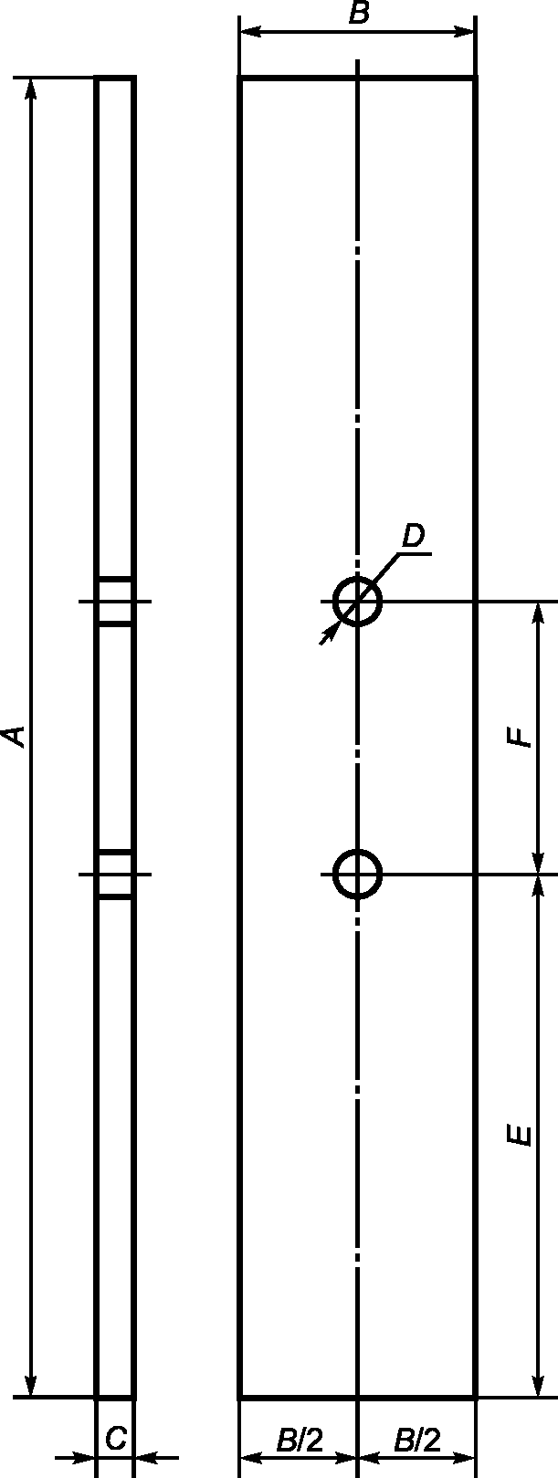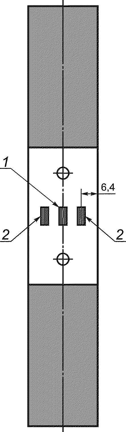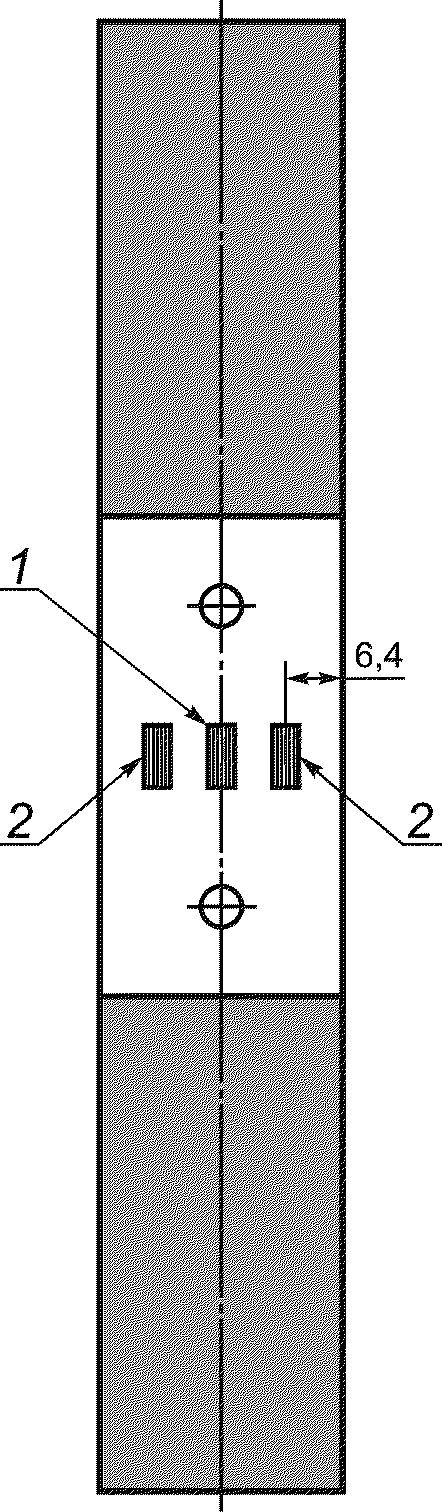 При испытании по методу Б один конец датчика деформации устанавливают на боковой поверхности одной из полос (см. 6.3.1) между отверстиями для крепежа, второй конец датчика - на боковой поверхности второй полосы. Номинальная база датчиков деформации должна быть 50 мм. Отклонение от номинальной базы - в пределах +/- 10%. При испытании по методу В устанавливают датчики деформации на лицевых сторонах образца и на приспособлении для испытания, как показано на рисунках 10, 12 и 13. Номинальная база датчиков должна быть 3 мм, напряжение - 1 или 2 В, сопротивление - не менее 350 Ом. Отклонение от номинальной базы - в пределах +/- 20%. |