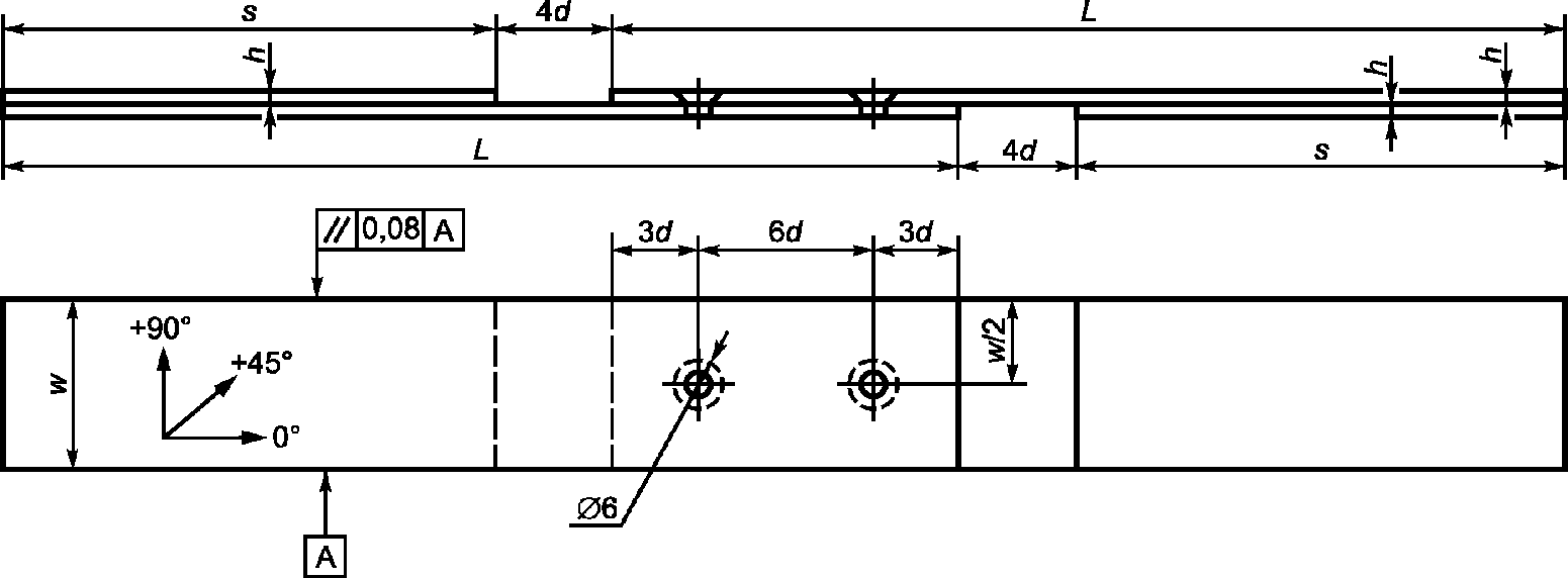 6.1.1 Для определения прочности на смятие и трансферной прочности ламинатов, соединенных двумя болтами, используют не менее пяти образцов, если иное не установлено в нормативном документе или технической документации на изделие. 6.1.2 Образцы изготавливают методом механической обработки по ГОСТ Р 56813 из пластин для испытаний, изготовленных в соответствии с нормативным документом или технической документацией на изделие, или из изделий и полуфабрикатов. При механической обработке образцов рекомендуется использовать смазочно-охлаждающие жидкости, не оказывающие влияние на свойства композитного материала. Отверстия должны быть просверлены до размера меньше номинального и затем развернуты до требуемого. Необходимо избегать расслаивания и других повреждений на кромках отверстия и вокруг него. 6.1.3 Образцы должны иметь гладкую, ровную поверхность, без вздутий, сколов, неровностей, надрезов, царапин, трещин или других видимых невооруженным глазом дефектов. 6.1.4 Образцы должны иметь маркировку. Маркировка должна содержать порядковый номер образца, сведения о материале, из которого образец изготовлен. Маркировка должна сохраняться в течение всего испытания, во всех условиях и режимах, установленных настоящим стандартом. 6.1.5 Композитный материал (ламинат) образцов должен иметь симметричную структуру относительно срединной плоскости. При армировании ровингами или лентами рекомендуется следующая последовательность укладки слоев армирующего наполнителя в ламинате: [45i/0j/ - 45i/90k]ms. При армировании тканями рекомендуется следующая последовательность укладки слоев армирующего наполнителя в ламинате: [45i/0j]ms. 6.1.6 При испытании на растяжение рекомендуется использовать образцы толщиной (2,5 +/- 0,1) мм; при испытании на сжатие - образцы толщиной (4,0 +/- 0,1) мм. 6.2 Требования к образцам для испытаний по методу А |