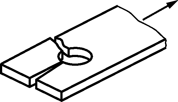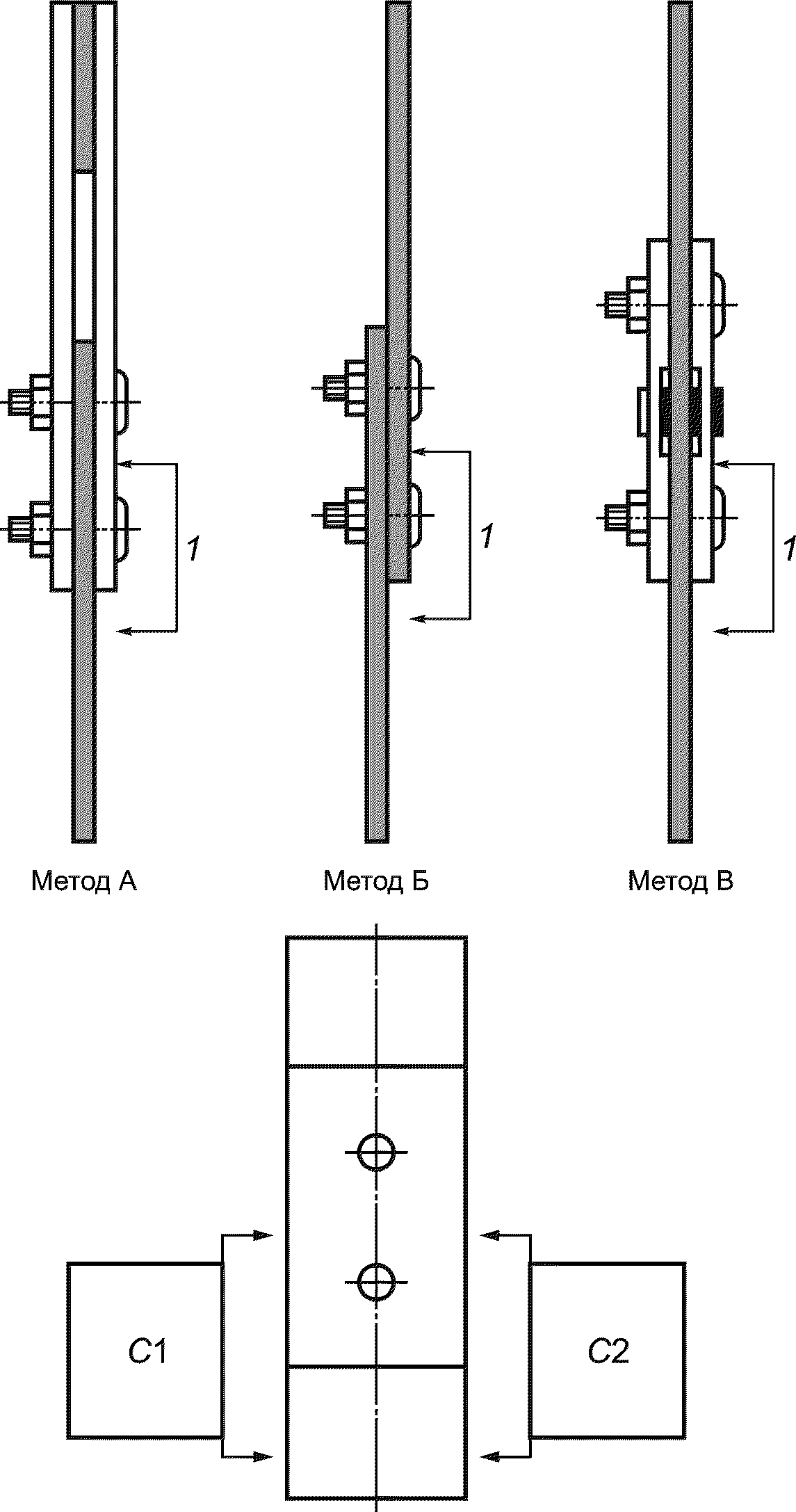 Сущность метода заключается в кратковременном испытании на растяжение или сжатие образца в виде пластины прямоугольного сечения с двумя отверстиями через болты, вставленные в эти отверстия (методы А и В), или в кратковременном испытании на растяжение или сжатие образца в виде двух соединенных при помощи двух болтов пластин прямоугольного сечения (метод Б). |