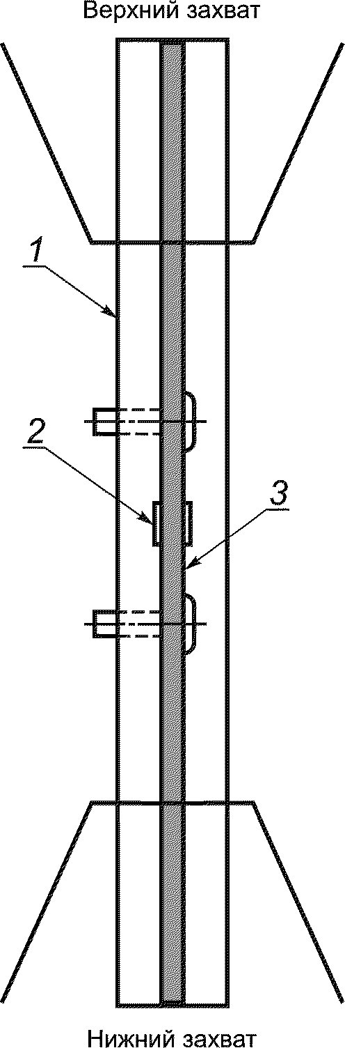 При испытании на сжатие по методу Б или В закрепляют на образце приспособление для испытаний, как показано на рисунке В.1 приложения В. 7.3 Образец устанавливают в захватах испытательной машины так, чтобы его продольная ось совпала с прямой, соединяющей точки крепления захватов в испытательной машине. После установки приспособления для испытания с образцом в захваты испытательной машины проверяют усилие затяжки болтов и при необходимости затягивают их до значения 7 Н·м. При испытании на сжатие по методу Б или В проверяют зазор между опорной пластиной и длинным зажимом, который должен быть не более 0,12 мм. Если зазор более 0,12 мм, между опорной пластиной и длинным зажимом вставляют регулировочную прокладку. Проверяют зазор между длинными и короткими зажимами, который должен быть не более (0,05 +/- 0,05) мм. 7.4 Для измерения деформации смятия устанавливают датчики деформации на боковых сторонах образца, как показано на рисунке 11. |