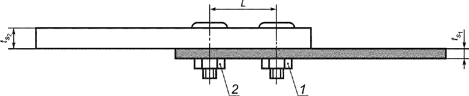 (28)8.2.14 Долю от общей нагрузки, передаваемую на образец через крепеж N 2 (см. рисунок 15), при испытании по методу Б и при использовании разных по толщине полос k2 вычисляют по формуле (22). |