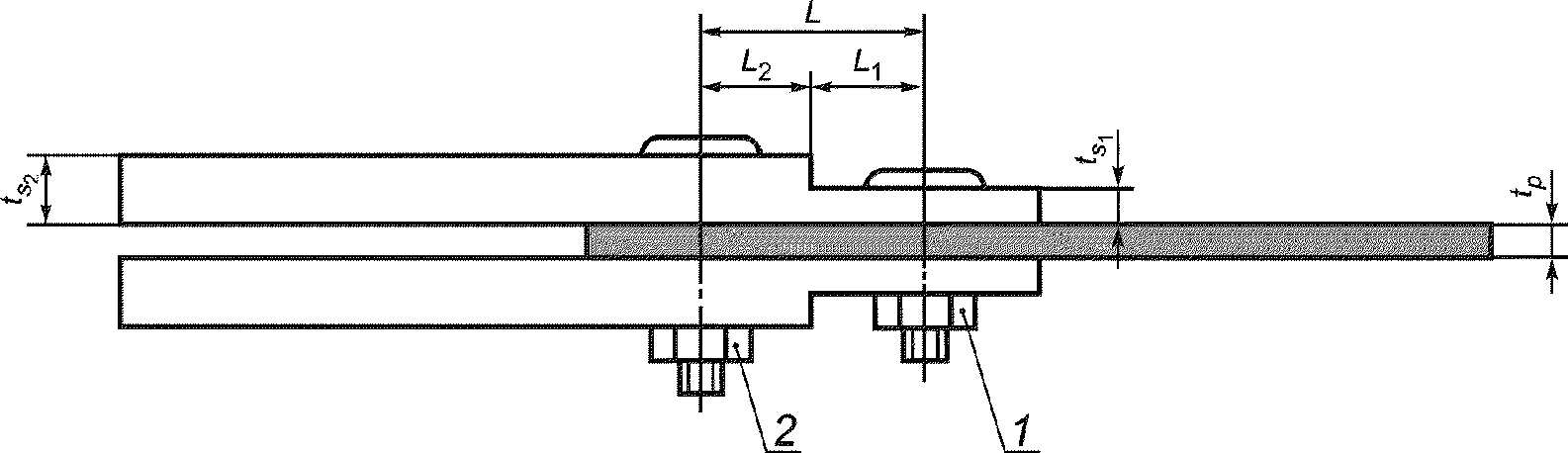 8.2.8 Долю от общей нагрузки, передаваемую на образец через крепеж N 1 (см. рисунок 15), при испытании по методу Б и при использовании одинаковых по толщине полос (см. 6.3.1) k1 вычисляют по формуле |