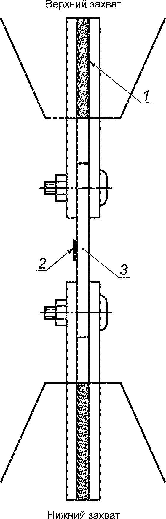 7.1 Испытания при нормальной температуре проводят в помещении или закрытом объеме при тех же условиях, при которых проводилось кондиционирование, если иное не установлено в нормативном документе или технической документации на изделие. Испытания при повышенных и пониженных температурах проводят в климатических камерах. Температуру испытаний определяют в соответствии с нормативным документом или технической документацией на изделие. При проведении испытаний в условиях повышенных и пониженных температур время, необходимое для полного прогрева или охлаждения образца до его испытания, следует задавать в нормативном документе или технической документации на изделие. 7.2 При испытании на растяжение по методу А закрепляют на образце приспособление для испытания, как показано на рисунке 9. |