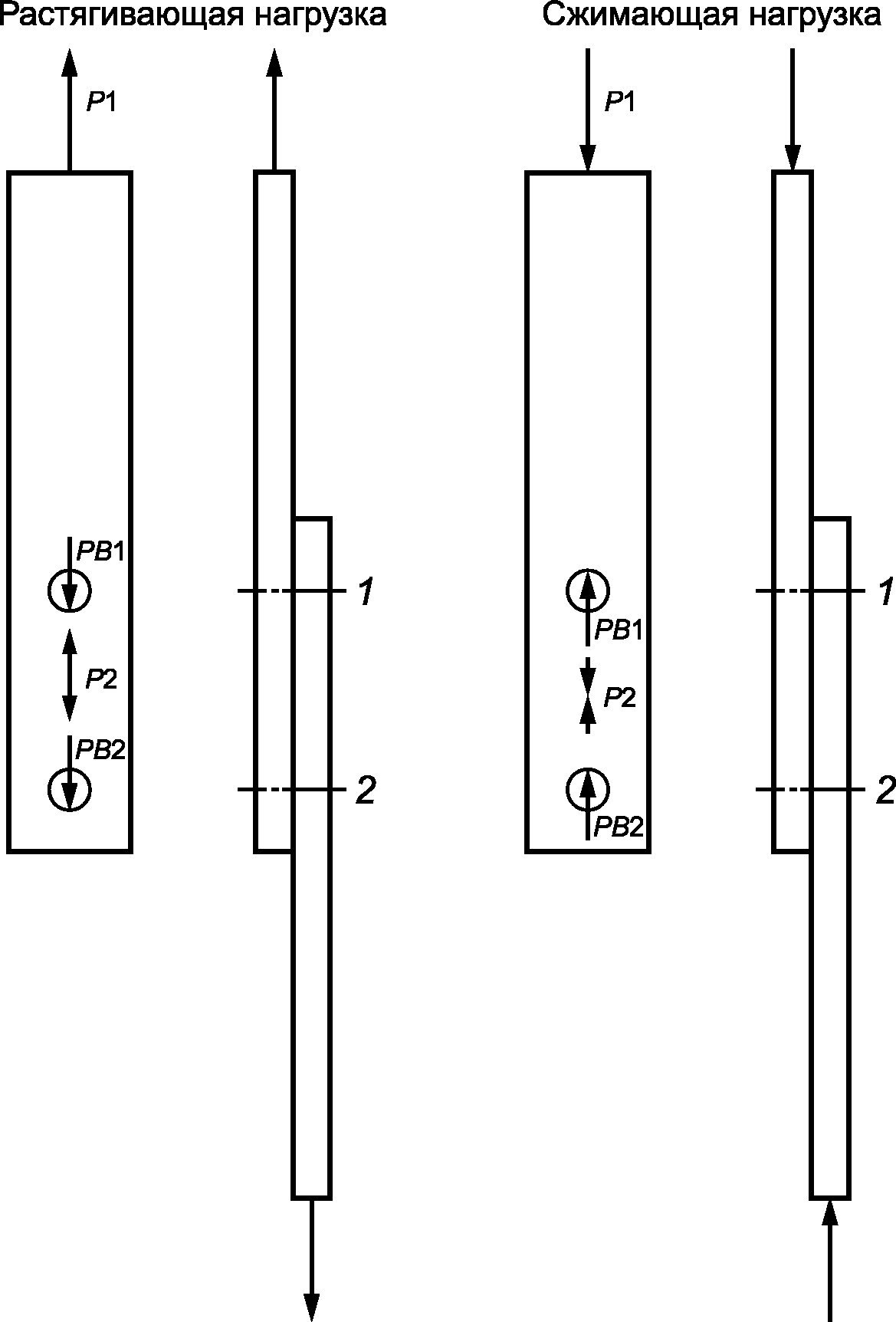 1, 2 - отверстия; P1 - растягивающая/сжимающая нагрузка; P2 - растягивающая/сжимающая нагрузка между отверстиями; PB1 - несущая способность отверстия 1; PB2 - несущая способность отверстия 2 поперечном сечении и трансферного напряжения в ослабленном поперечном сечении |