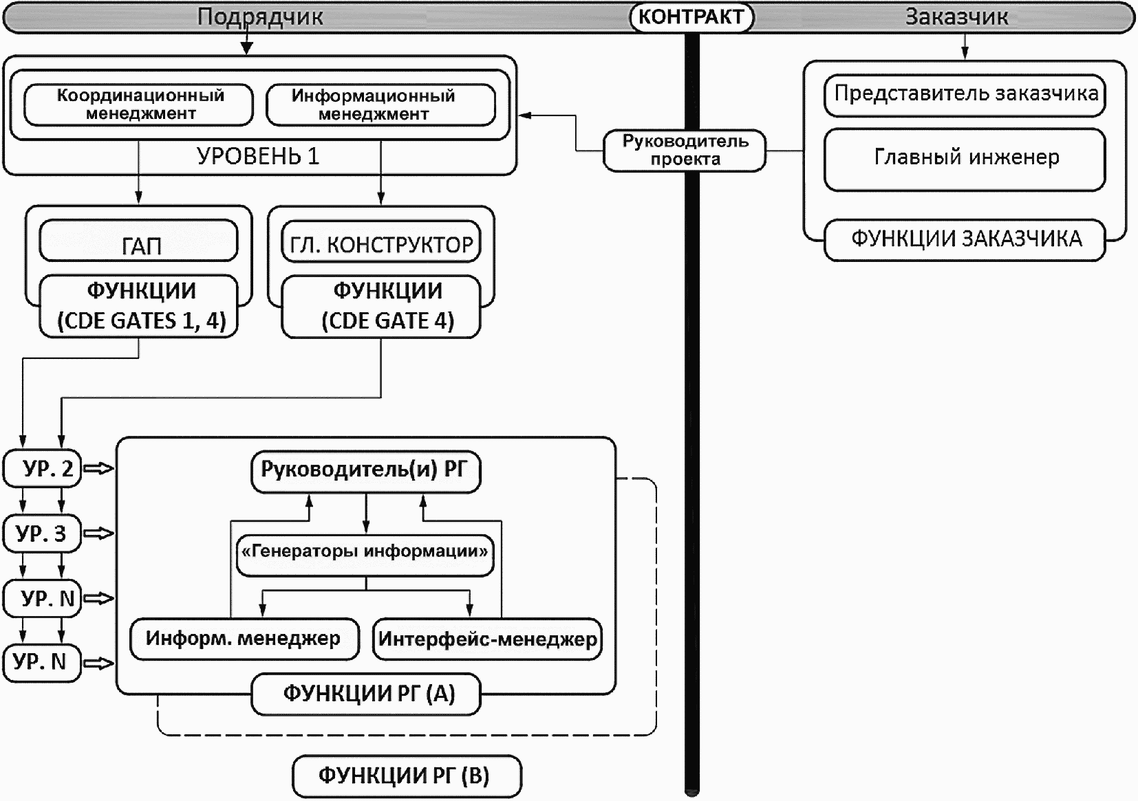 Руководитель проекта несет полную ответственность перед заказчиком за общее развитие проекта. Расположения его функций на схеме зависит от выбранной финансовой стратегии. Например, в случае заключения контракта "под ключ" они будут находиться в левой части схемы, в случае внешнего управления строительством - в правой.
