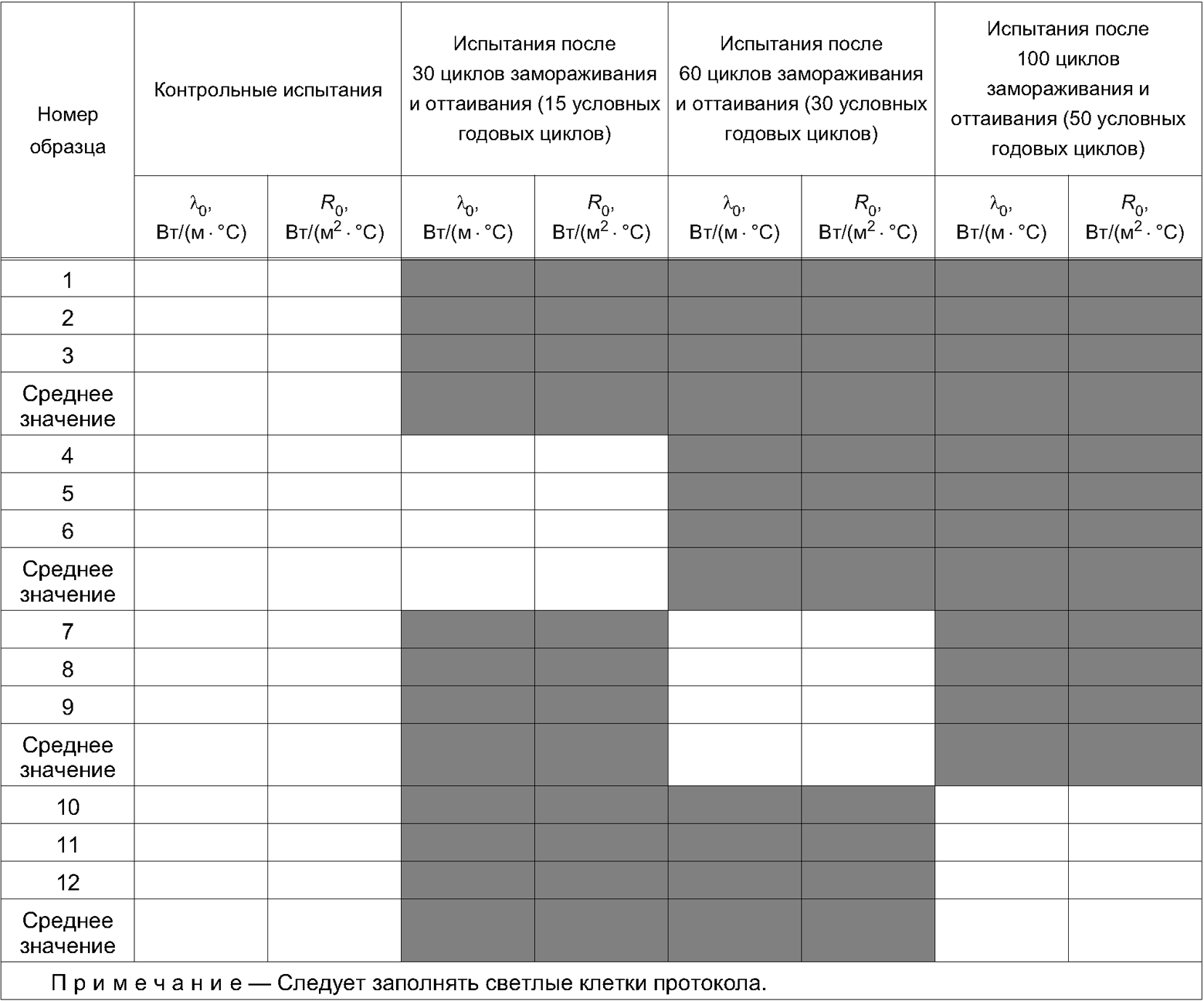 10.1 За результат каждого испытания (контрольного, после 15, 30 и 50 условных годовых циклов) по определению теплопроводности и термического сопротивления принимают среднеарифметическое значение результатов каждого испытания (контрольного, после 15, 30 и 50 условных годовых циклов) трех образцов.