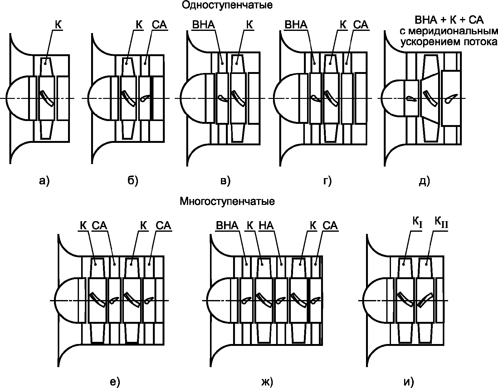 К - рабочее колесо; СА - спрямляющий аппарат; ВНА - входной