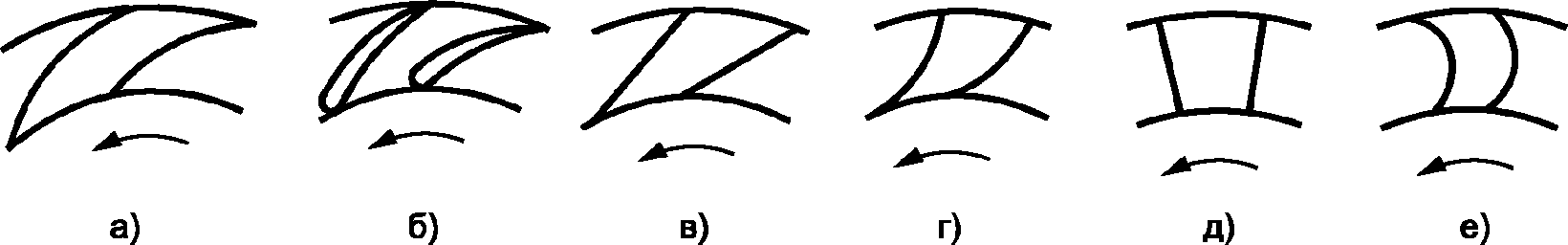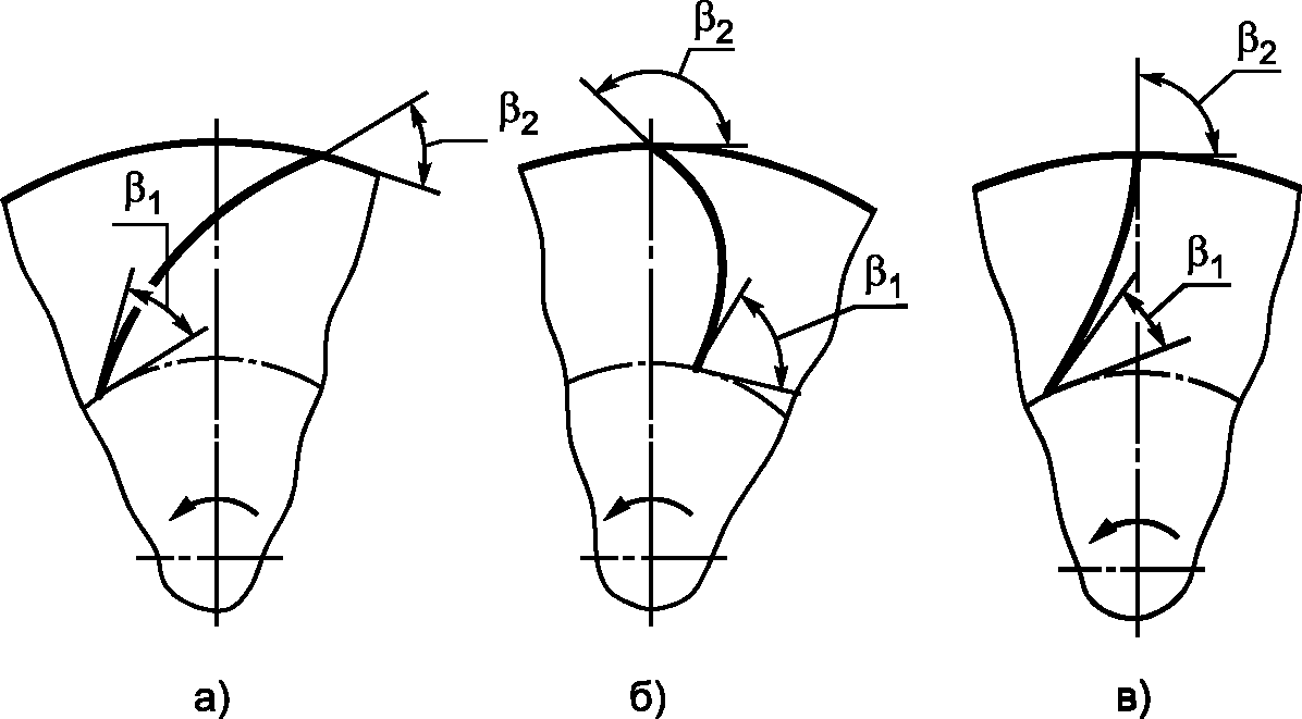 3.1.8 лопатки рабочего колеса, загнутые вперед: Лопатки рабочего колеса, выходной участок которых загнут по направлению вращения рабочего колеса.