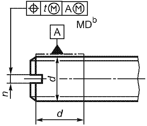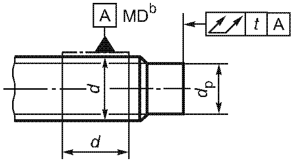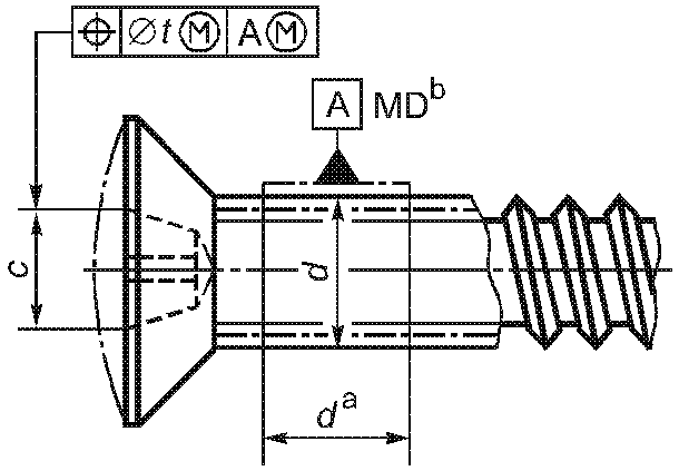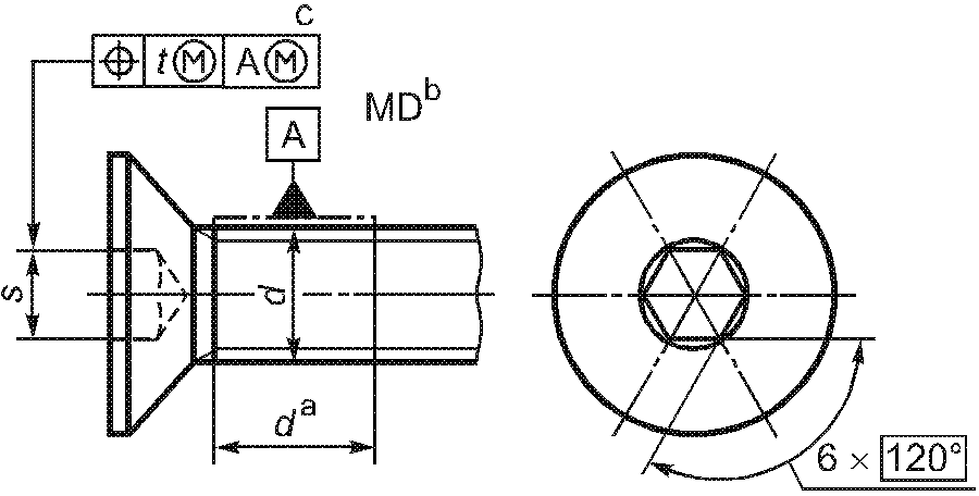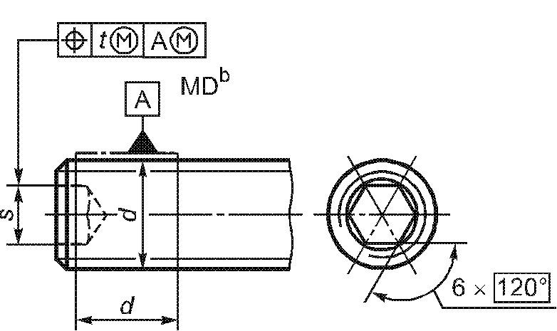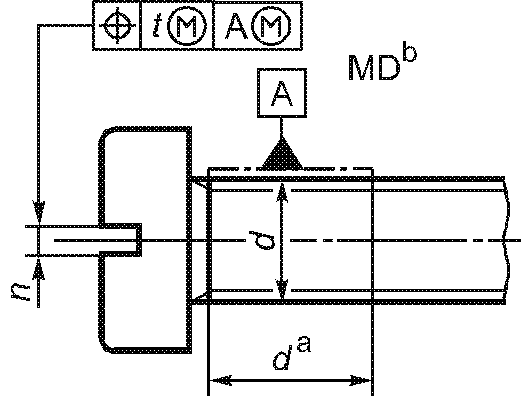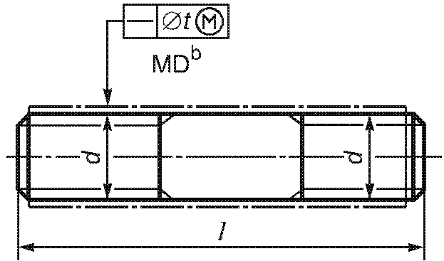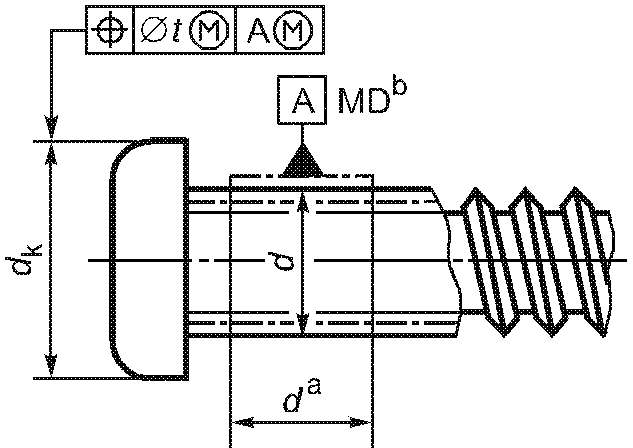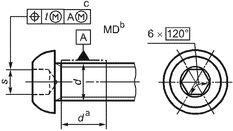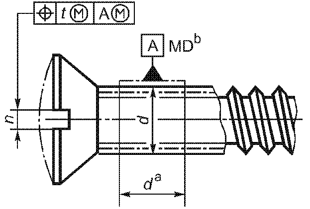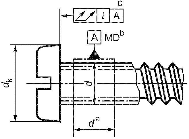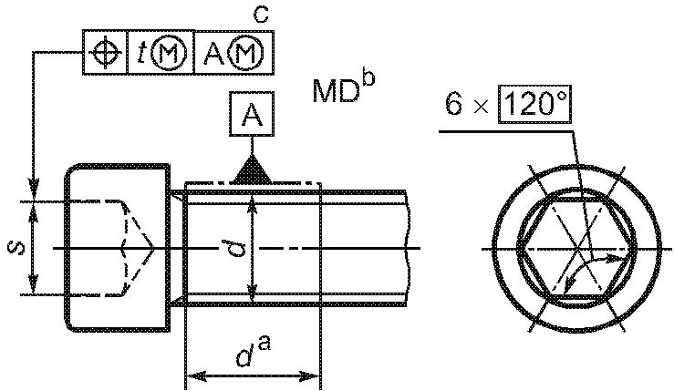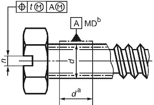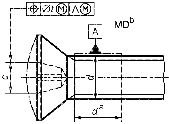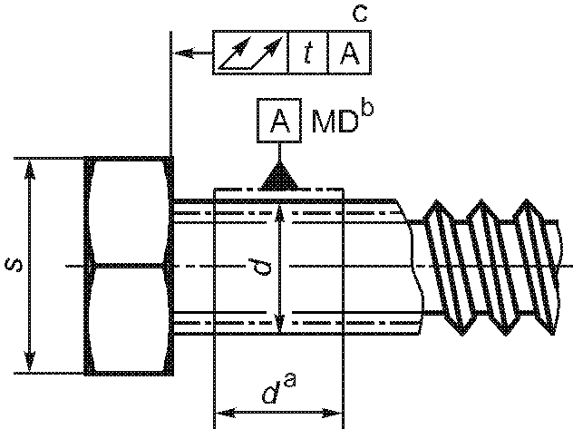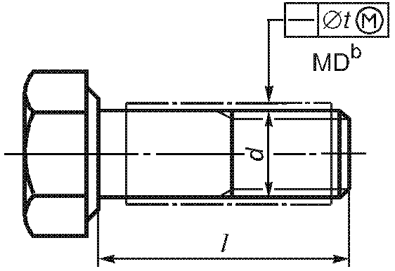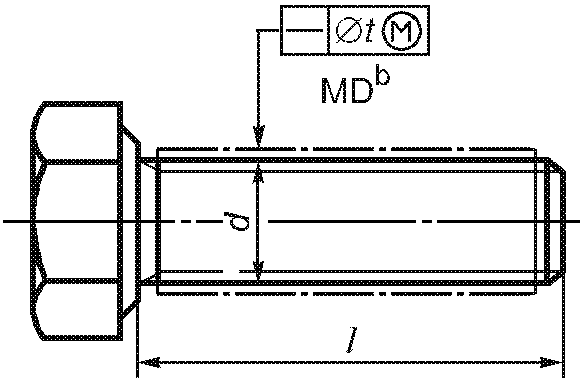 -------------------------------- <a> База A должна быть расположена по возможности ближе к головке, на расстоянии не более 0,5d, и должна включать либо весь участок без резьбы, либо весь участок с резьбой, но не должна включать сбег резьбы или скругление под головкой. <b> Буквы MD означают, что допуск относится к оси цилиндра, диаметр которого равен диаметру резьбы. <c> 3-х одновременно. | ||||||