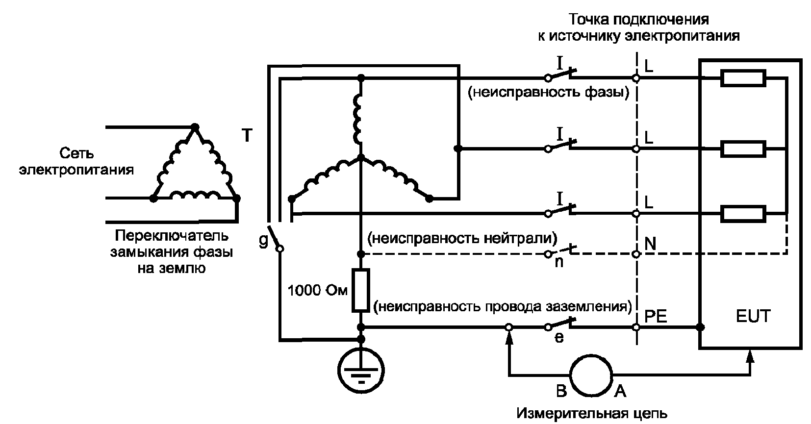 Производитель должен указать конфигурацию электросети с системой заземления (TN, TT, звезда IT и т.д.), к которой планируется подключить оборудование при его эксплуатации. Проверяемое оборудование должно подвергаться испытаниям при указанных конфигурациях или при наиболее неблагоприятном варианте.