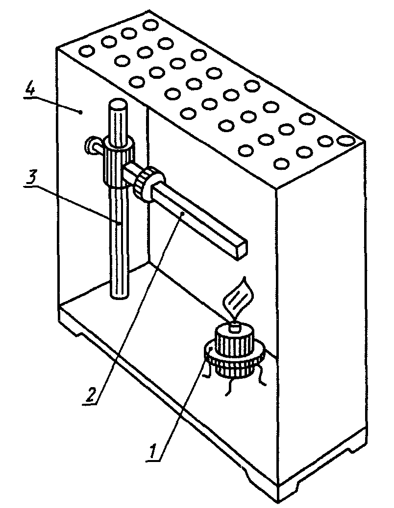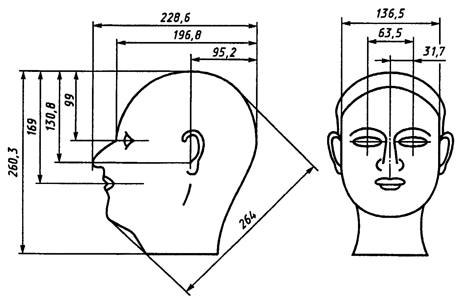 6.16) проводят в газовой камере. Газовая камера - газонепроницаемая камера, изготовленная из стекла с внутренними размерами 560 х 560 х 560 мм и плотно закрывающейся крышкой. Газовая камера должна вентилироваться с помощью небольшого вентилятора и вытяжной трубы. В газовой камере устанавливают макет головы с защитными очками, которые фиксируются симметрично над индикаторной бумагой (рисунок 8). Допускаются другие размеры макета головы.