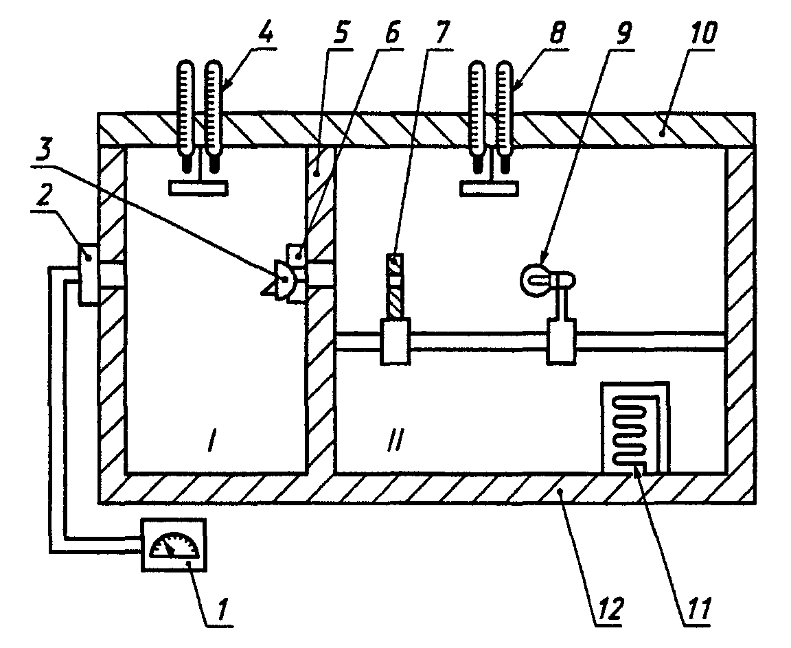 - на смену температур - путем воздействия на очки трех непрерывно следующих друг за другом циклов. В каждом цикле очки помещают в камеру холода, температуру которой заранее доводят до минус 30 °С, и выдерживают в течение 4 ч, затем их вынимают из камеры холода и переносят в камеру тепла, в которой заранее установлена температура 40 °С. Очки выдерживают в камере тепла в течение 4 ч. Время переноса очков из камеры в камеру не должно превышать 5 мин;