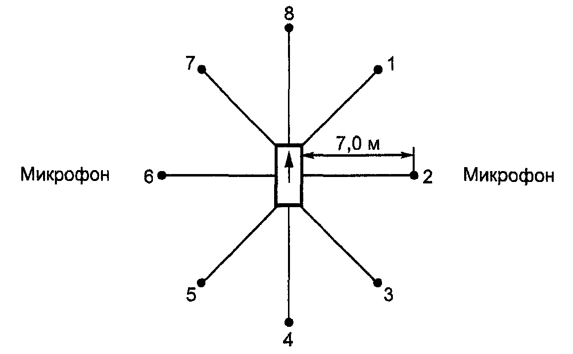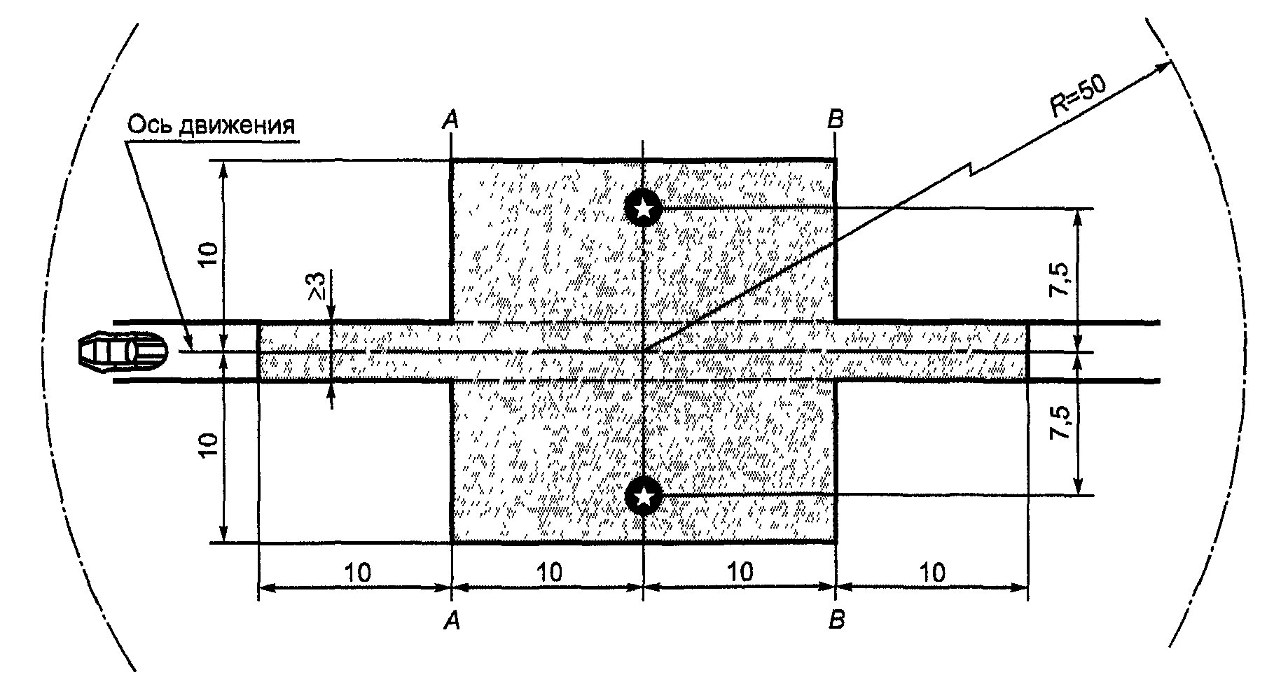 рисунок И.1). Для исключения неоднородности и неровности покрытия на участках траекторий колес образцы покрытия должны высверливаться не на самих траекториях колес, а рядом с ними. Два образца (не менее) должны высверливаться рядом с траекториями колес и один образец (не менее) - приблизительно посередине между траекториями колес и каждой точкой расположения микрофона.