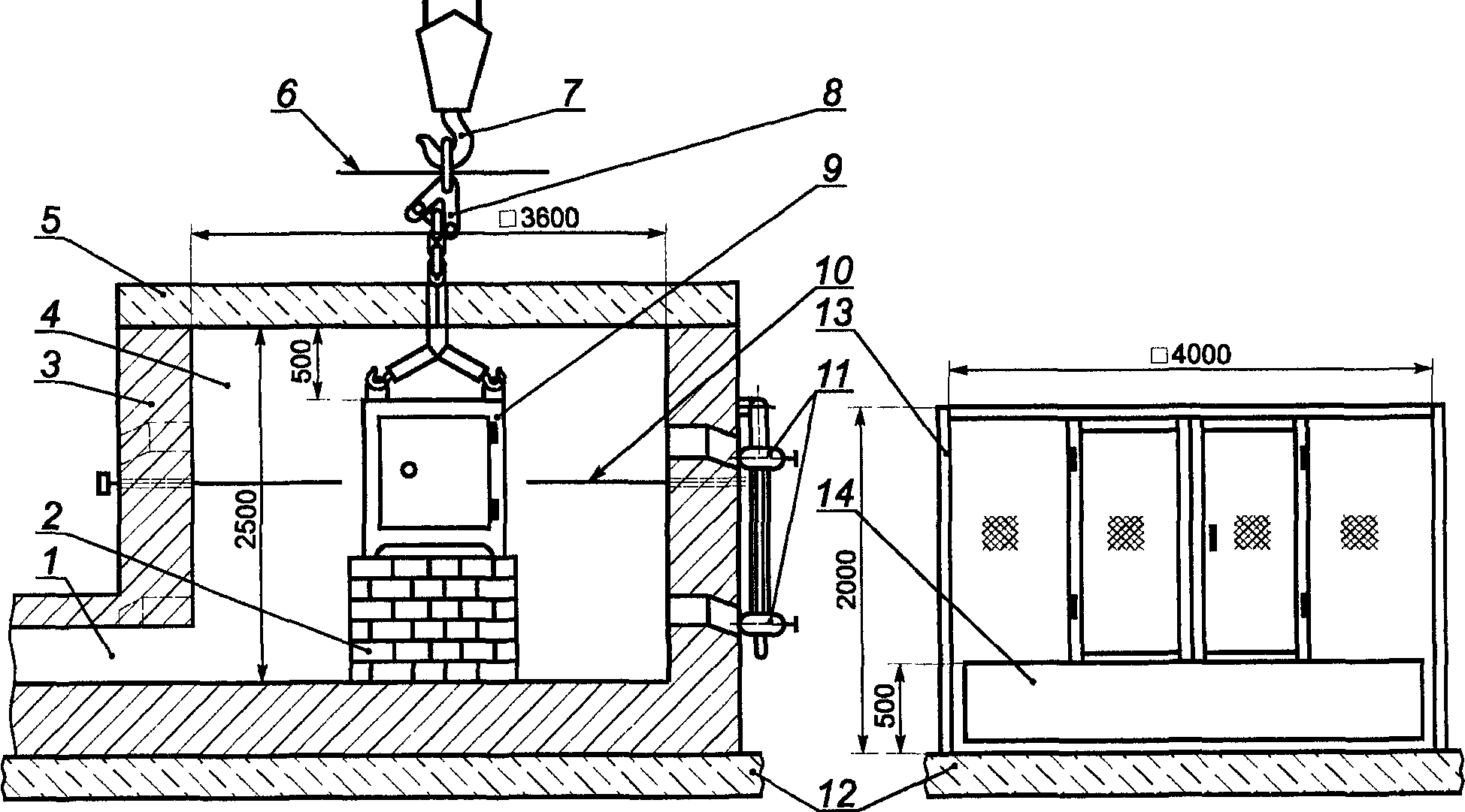 10 - термопары печные; 11 - форсунки; 12 - фундамент;
