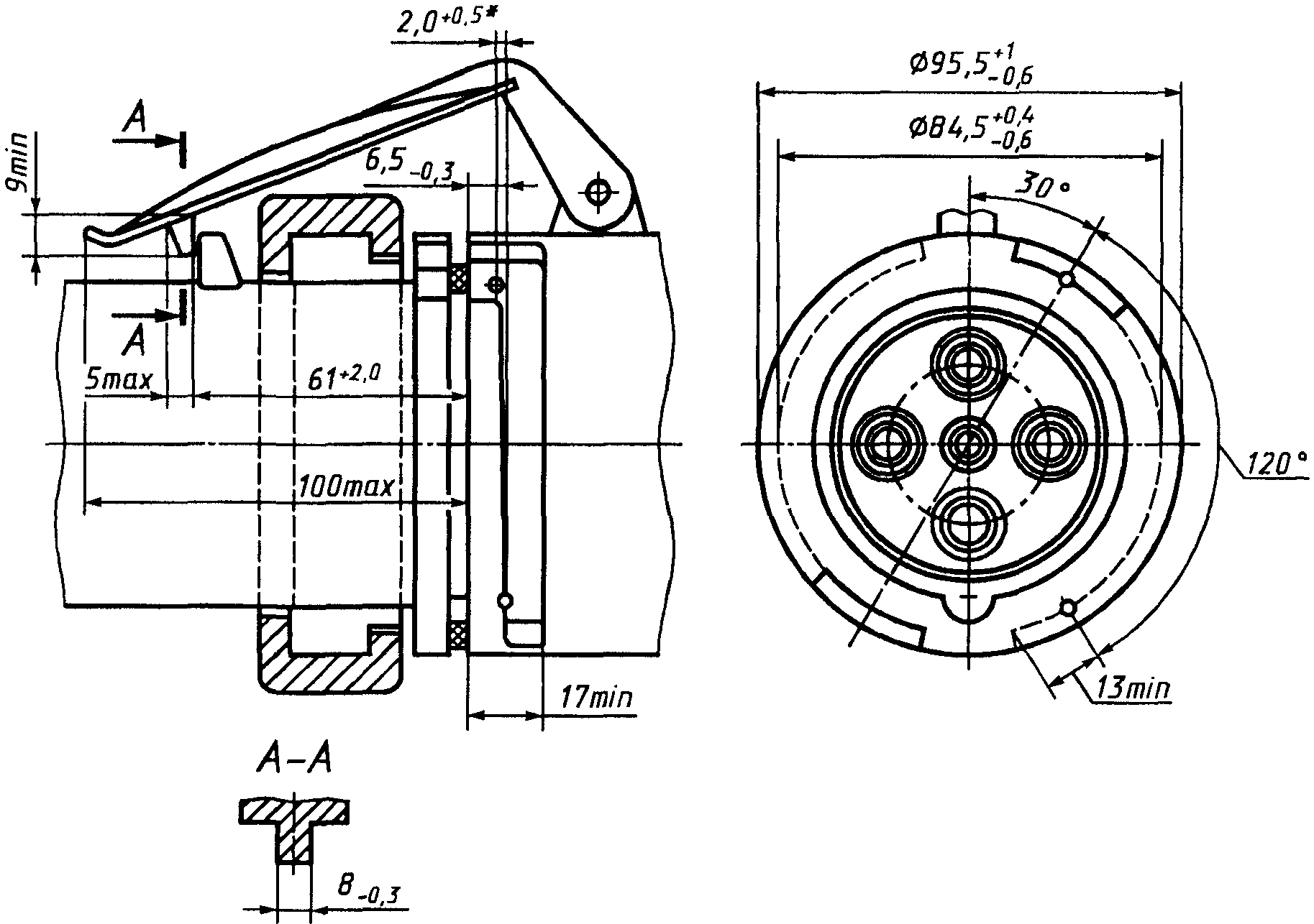 Не должно быть возможности ввести калибр B в правильное положение во фланец штепсельной или переносной розетки.