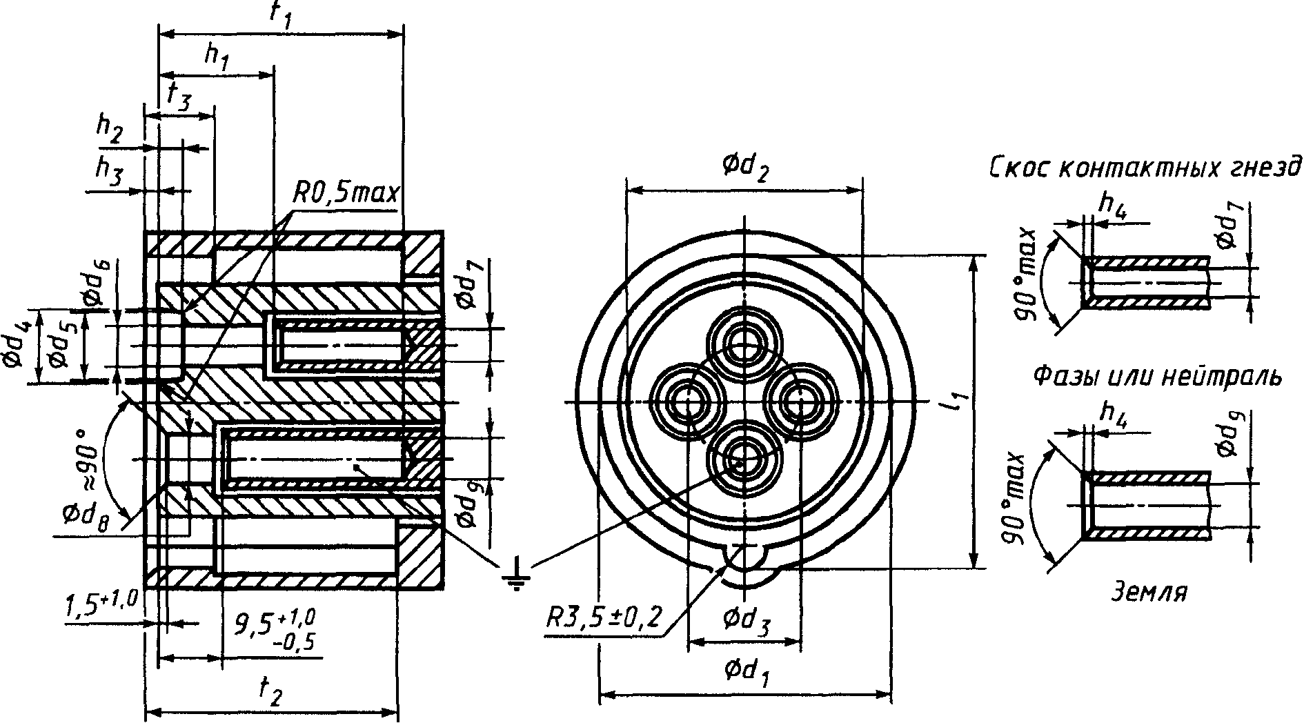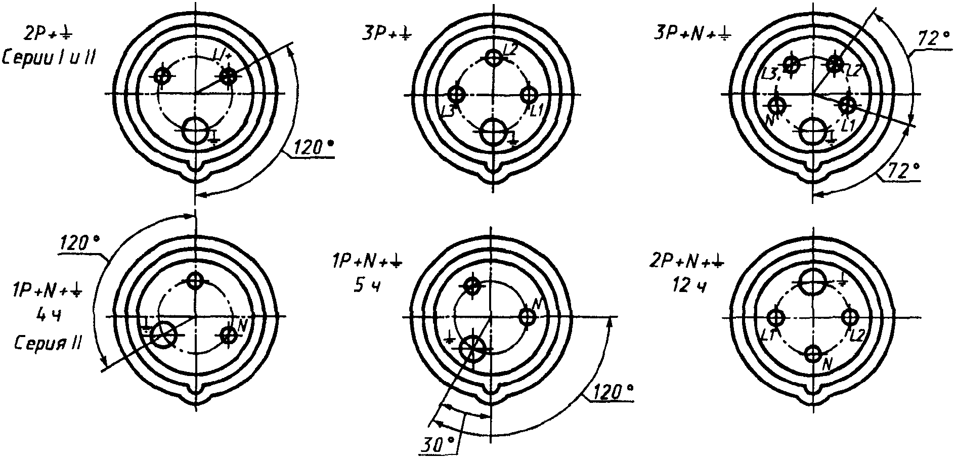 В трехфазных соединителях нет необходимости в обозначении напряжения между фазой и нейтралью, если она имеется.