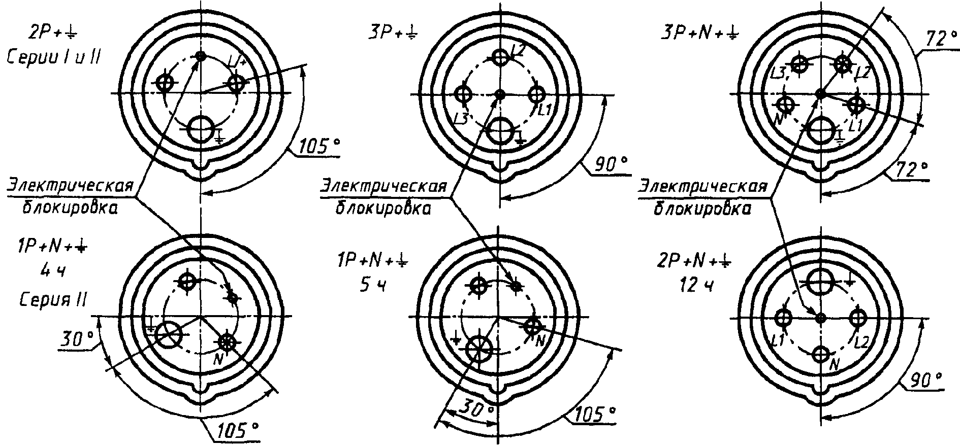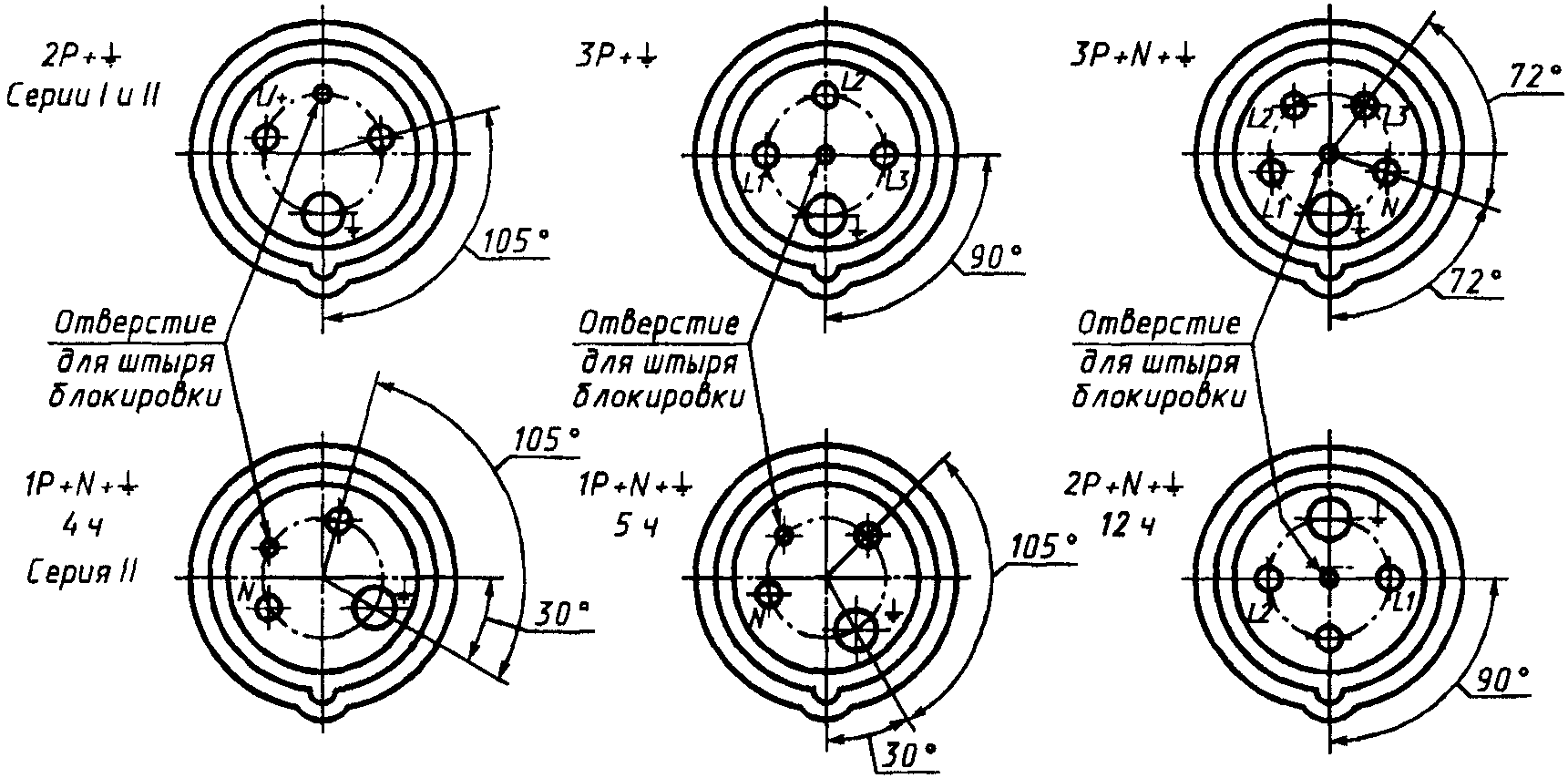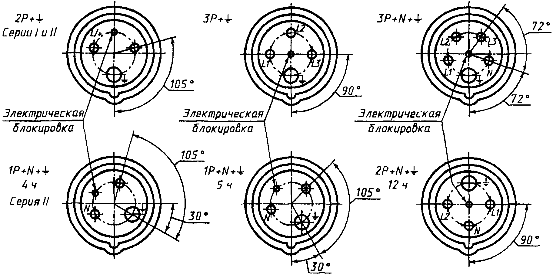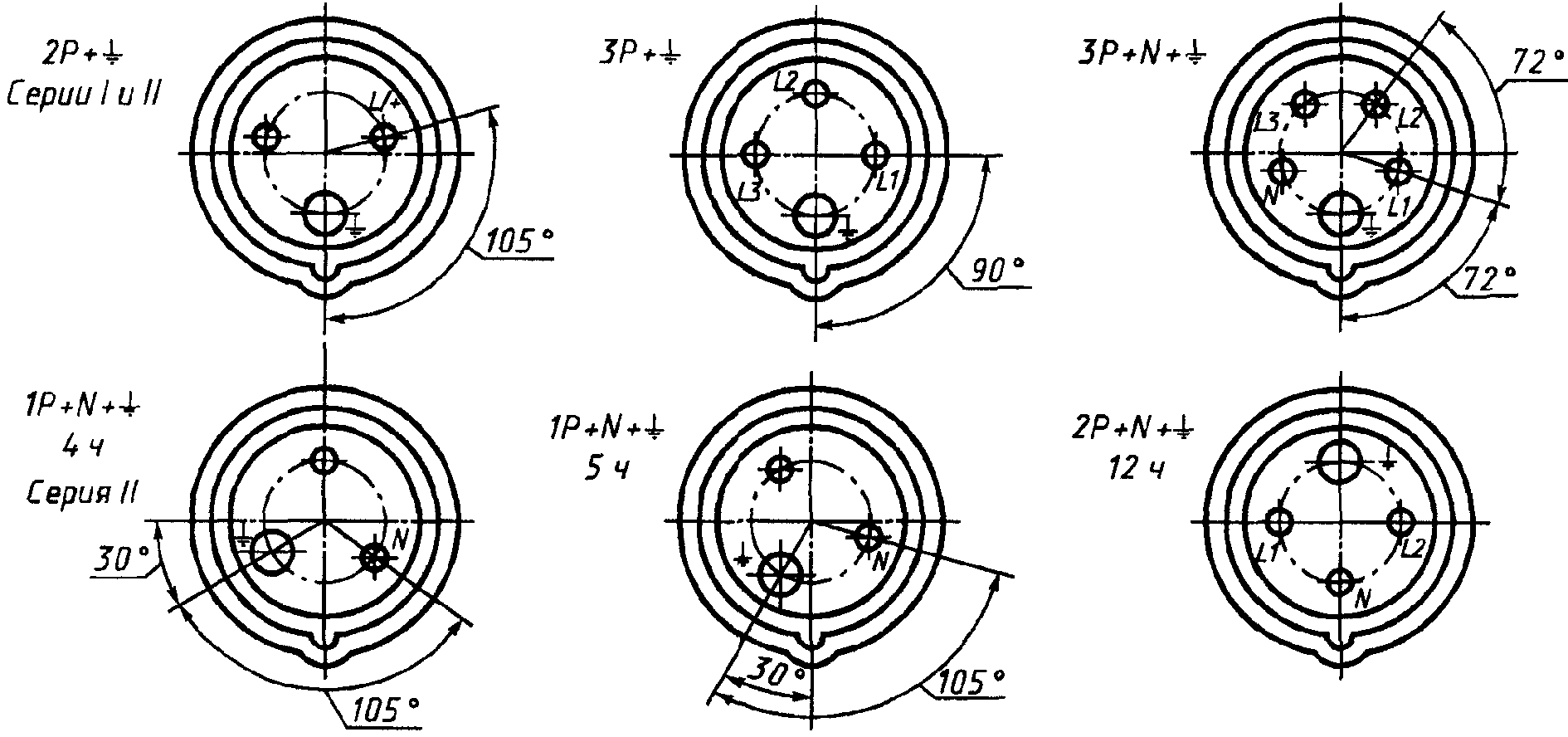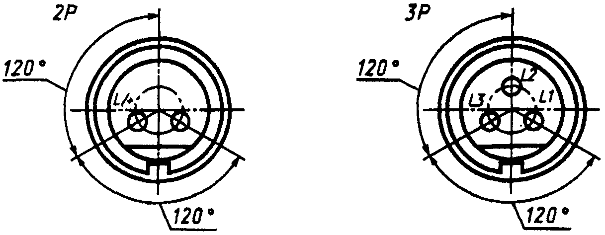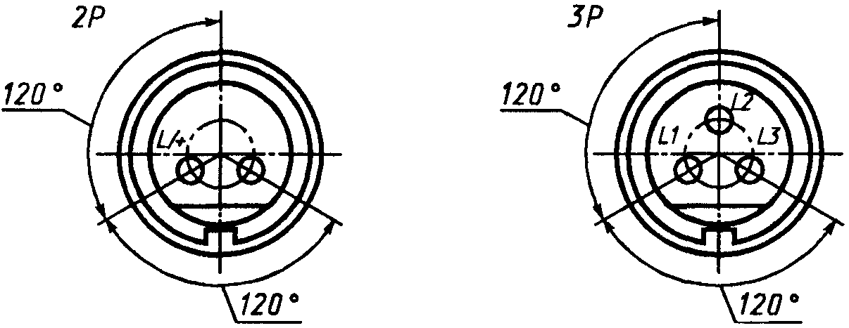 Эти обозначения располагают после маркировки номинального тока, отделяя от нее тире, если символ, указывающий положение заземляющего контакта или дополнительного ключа (выступа или выемки), и цифра, указывающая номинальное рабочее напряжение, разделены косой чертой.