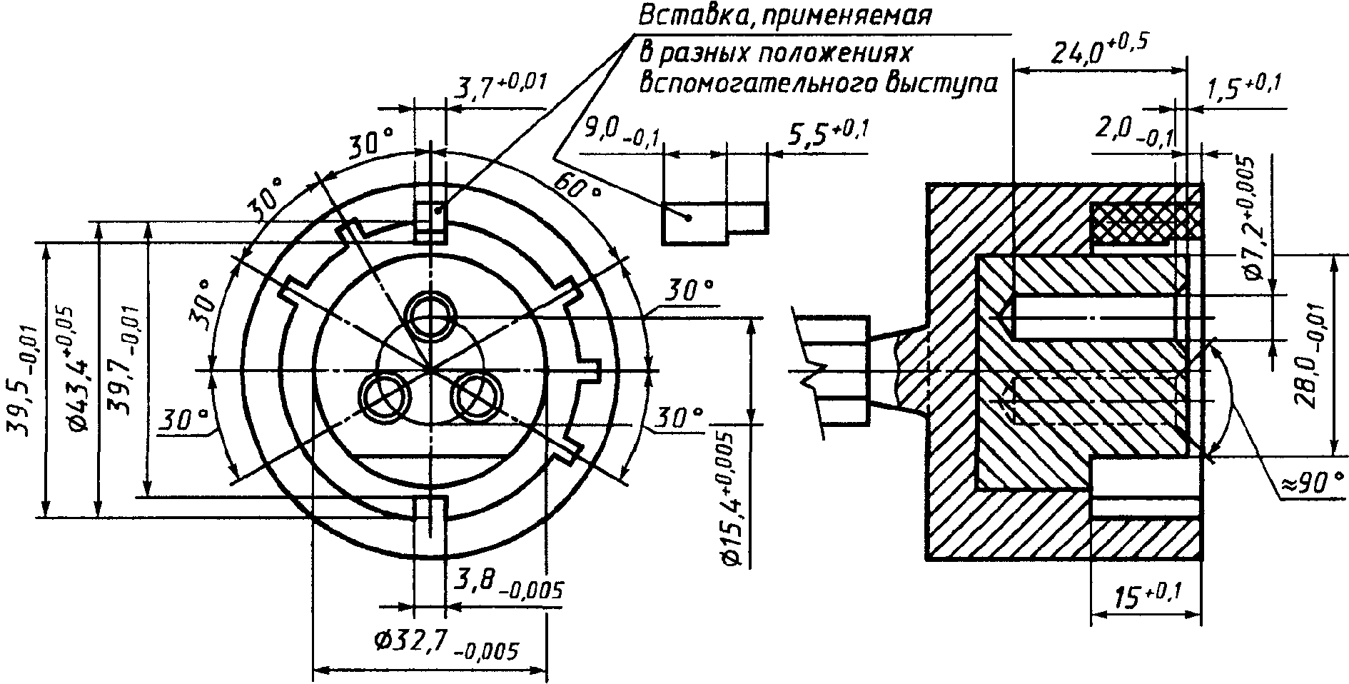 В любом положении вставки не должно быть возможно введение калибра в правильном положении поверх фланца вилки или вводного устройства.