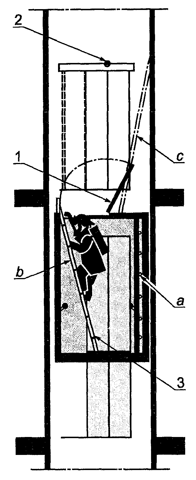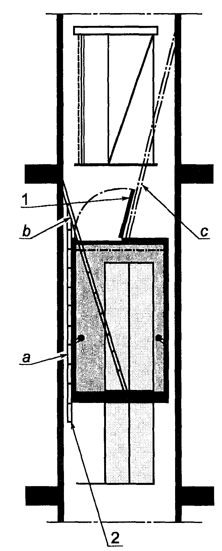 - пожарный открывает люк, снимает закрепленную снаружи кабины лифта лестницу (позиция а) и опускает ее в кабину (позиция b);