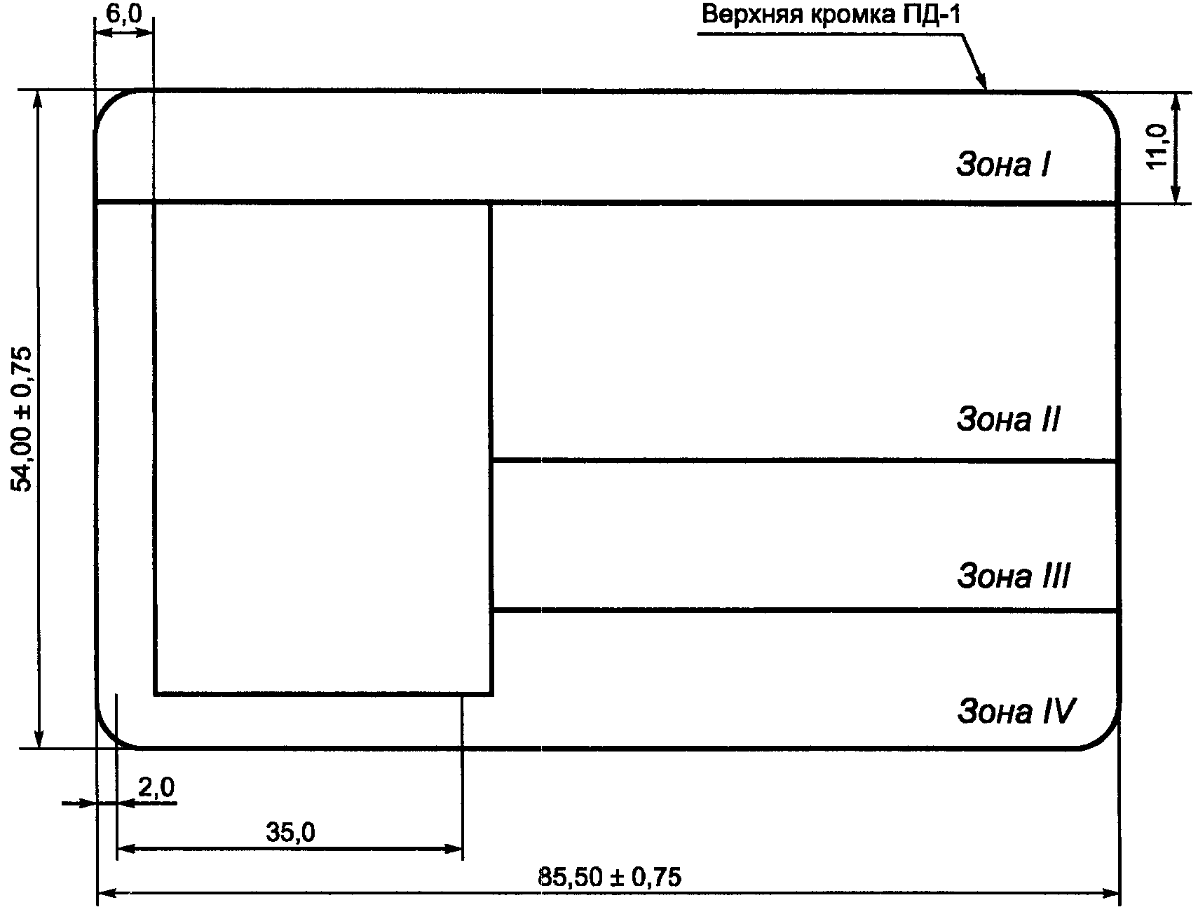 4.1.1. Номинальные размеры документов ПД-1 и ПД-2 должны соответствовать требованиям ГОСТ Р ИСО/МЭК 7810 (за исключением толщины) для карт ID-1 и ID-2. Конкретные номинальные размеры следует устанавливать в технических условиях на документы конкретного вида по выбору организации выдачи конкретного документа и должны соответствовать: