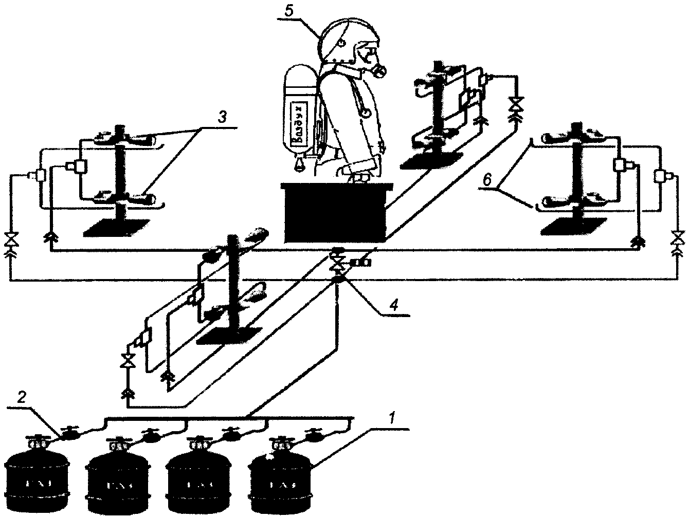 3.1. Аппарат дыхательный со сжатым воздухом с открытым циклом дыхания: автономный изолирующий резервуарный аппарат, в котором запас воздуха хранится в баллонах в сжатом состоянии. При работе аппарата вдох осуществляется из баллонов, а выдох в атмосферу.