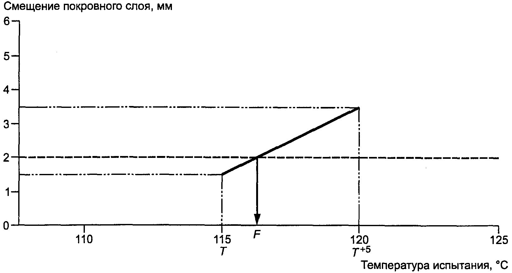 3.2. Предельное значение теплостойкости (flow resistance limit) F: температура, при которой покровные слои вертикально подвешенного образца материала в заданных условиях испытания смещаются относительно основы на 2 мм (см.