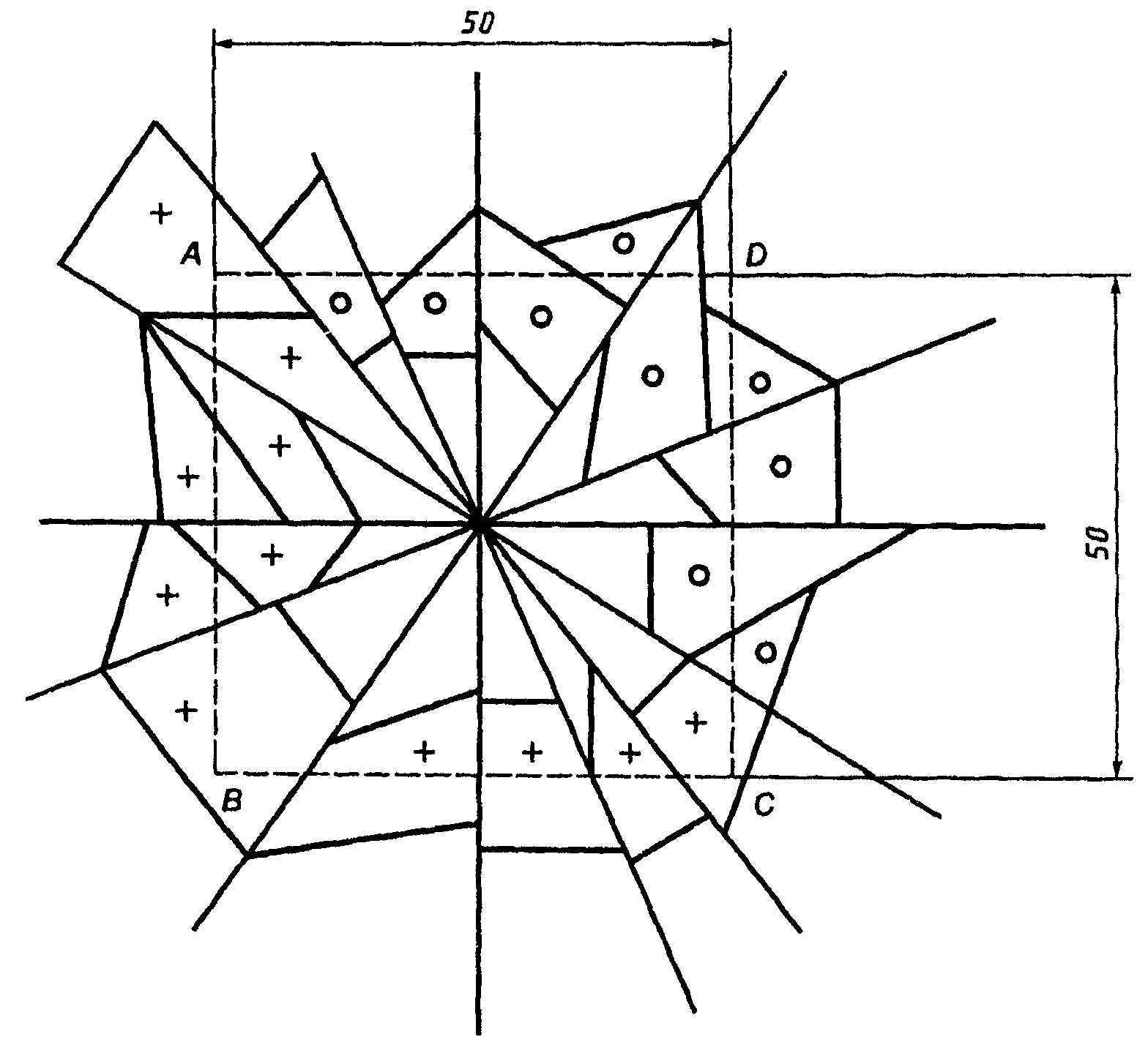 Примечание. При подсчете числа осколков в квадрате со стороной 50 мм учитывают также осколки в центре квадрата и у края. При подсчете осколков у края квадрата рекомендуется учитывать все осколки, пересекаемые любыми двумя смежными сторонами, за исключением осколков, пересекаемых двумя другими сторонами (см. рисунок 1).