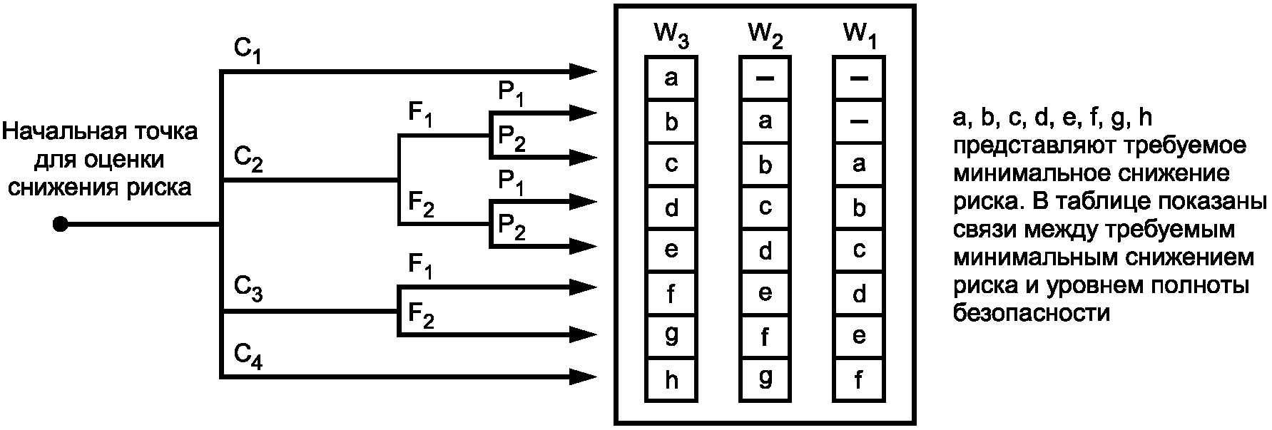 Приложении C, не применим в тех случаях, где риск (или его частотная составляющая) не может быть охарактеризован количественно. В настоящем приложении описывается метод матрицы тяжести опасных событий, представляющий собой количественный метод, позволяющий определить уровень полноты безопасности E/E/PE системы, связанной с безопасностью, на базе знания факторов риска, связанных с EUC и системой управления EUC. Он применим, в частности, для модели риска, показанной на