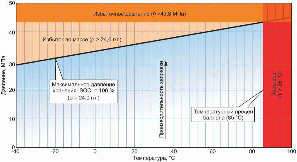 рисунке 1 представлены граничные условия температуры и давления заправки для класса давления H35. Максимальная температура газа в СХКВ и максимальное рабочее давление являются фиксированными пределами - в правой зоне графика перегрев и в верхней - избыточное давление. Максимальная плотность при 100% SOC создает дополнительное граничное условие. Примеры компонентов конструкции топливозаправочной системы, а также описание процедур, обеспечивающих их работу в обозначенных границах, приведены в