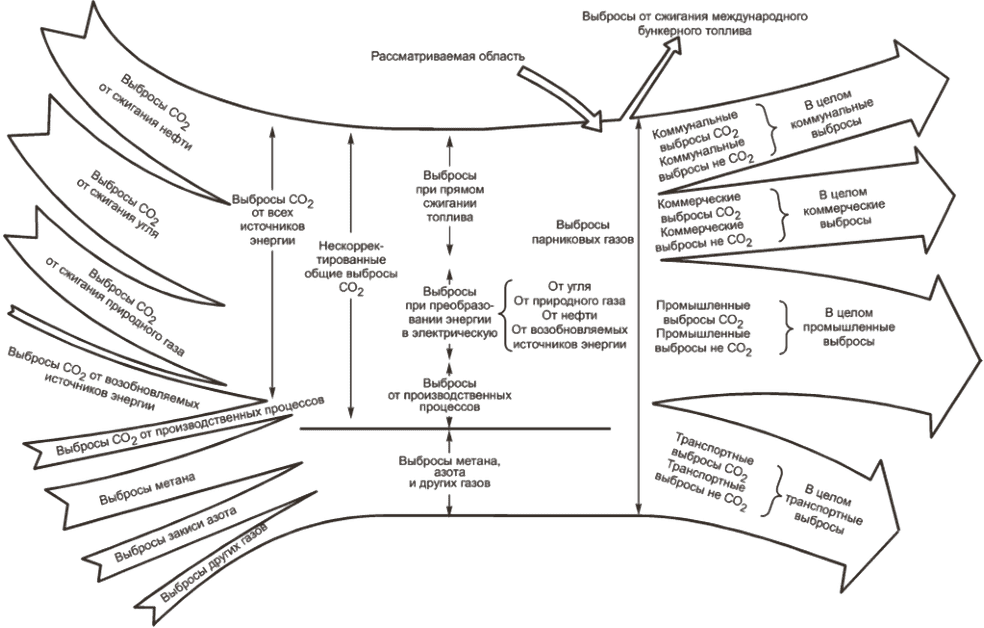 Большинство антропогенных выбросов ПГ обусловлены потреблением энергии различными бытовыми устройствами и при оказании населению различных услуг (включая непосредственное использование энергии для отопления или охлаждения), поэтому можно количественно оценивать риски по отдельным отраслям, принимая во внимание содержание углерода при потреблении энергии бытовыми устройствами и предоставлении услуг. Тем не менее, учитывая рассмотренные механизмы регулирования, для оценки бизнес-рисков, связанных с затратами (выгодами) и ценообразованием выбросов, наиболее целесообразно классифицировать выбросы ПГ по их источникам, а в случае электроэнергетики и транспорта - по секторам, наиболее зависимым от них.