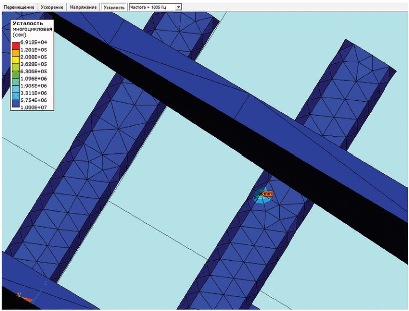 - время до усталостного разрушения во всех точках конструкции в диапазоне частот.