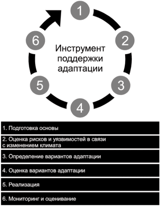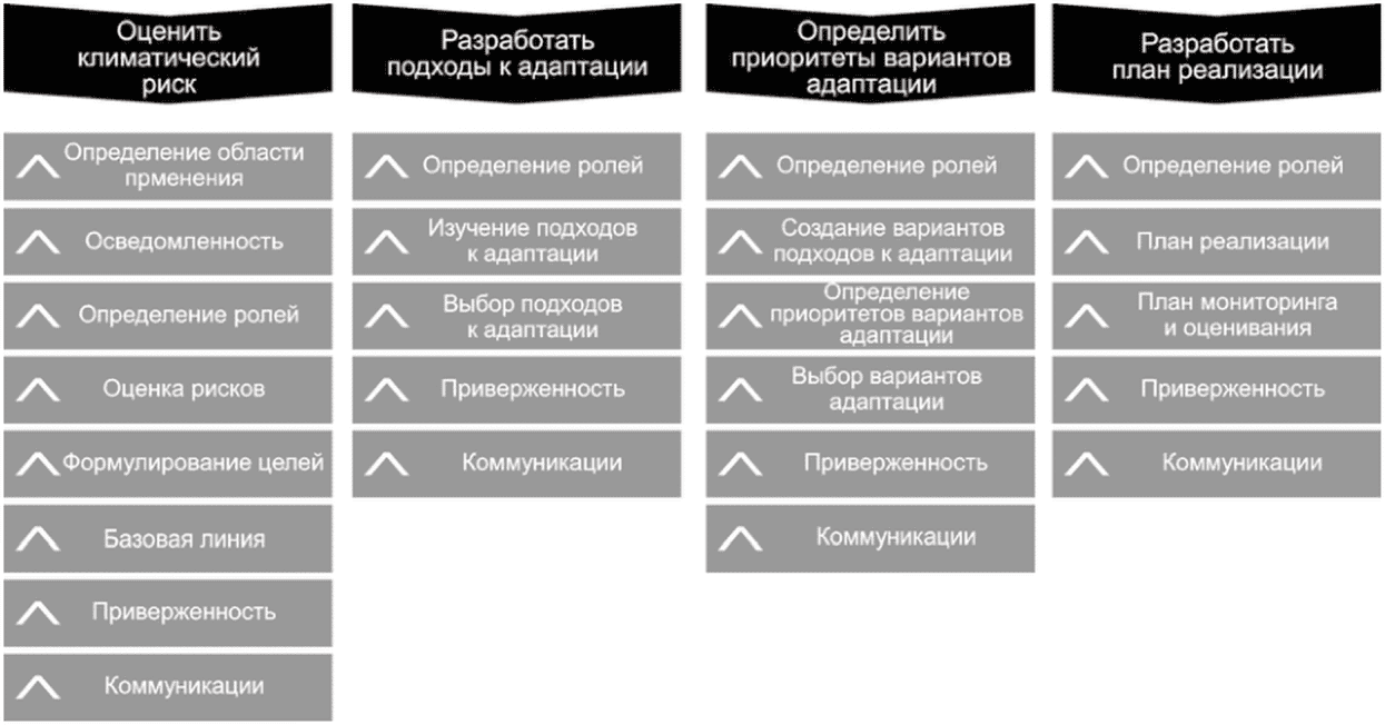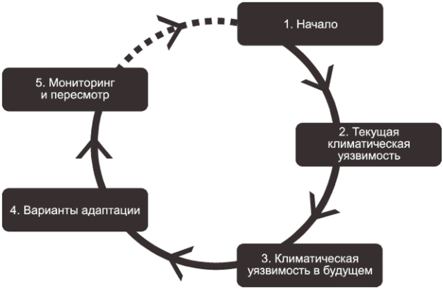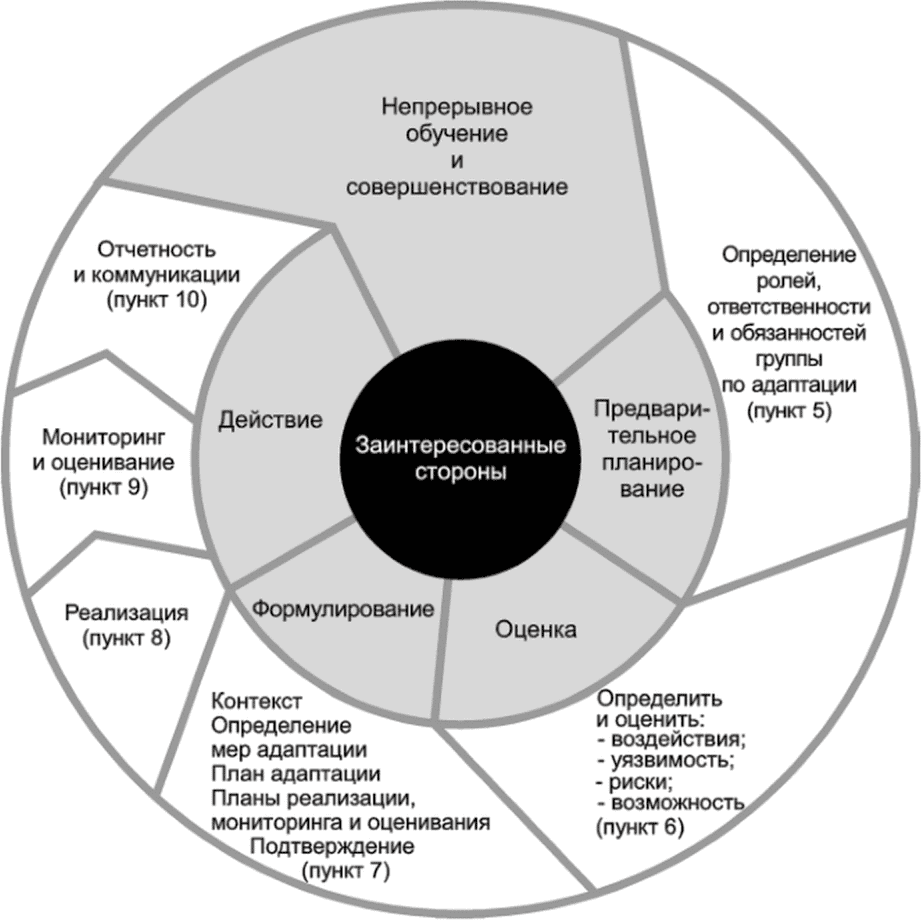 (рисунок B.3), который помогает оценить уязвимость организации к текущим и будущим изменениям климата, определить варианты снижения ключевых рисков организации, разработать и внедрить стратегию адаптации к изменениям климата.