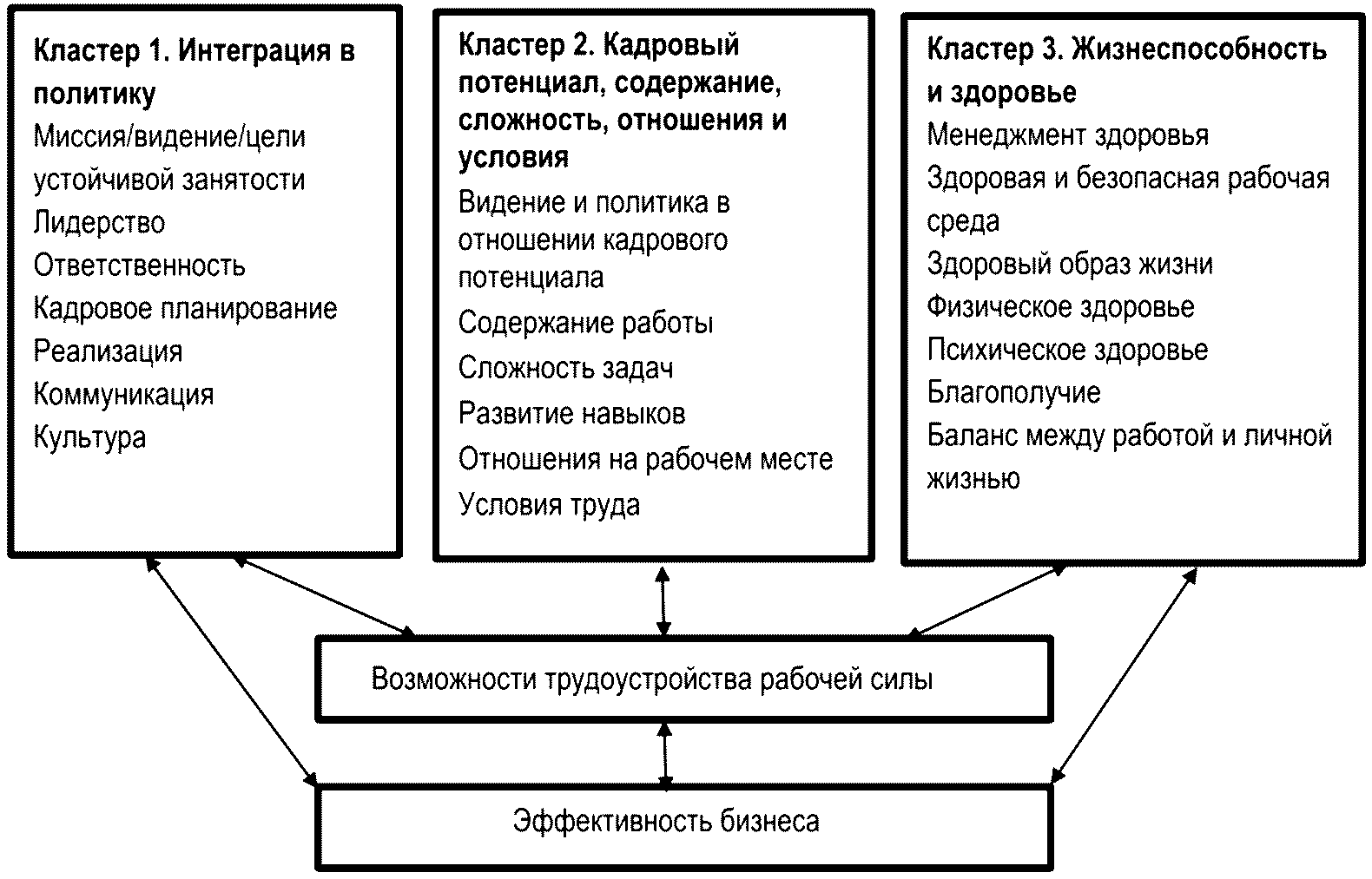 На рисунке 1 показаны три кластера устойчивой (возможности) занятости и отношения между организацией, человеком и эффективностью бизнеса. Если в организации уделяется внимание всем кластерам (т.е. эффективному планированию рабочей силы, возможностям, предоставляемым рабочей средой, а также вниманию организаций и отдельных лиц к вопросам развития навыков и благополучия), то положительный результат будет наблюдаться в работе организации, ощущаться отдельными лицами, а в более широком смысле отражаться на экономике в целом.