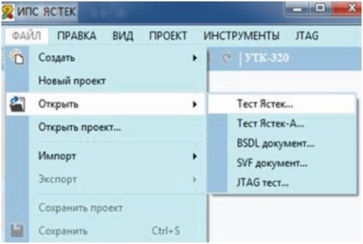 д) в меню выбирают пункты: "Файл", "Открыть", "Тест Ястек" и в окне выбора файла указывают путь к файлу "TEST_SAM_US.yas" (см.