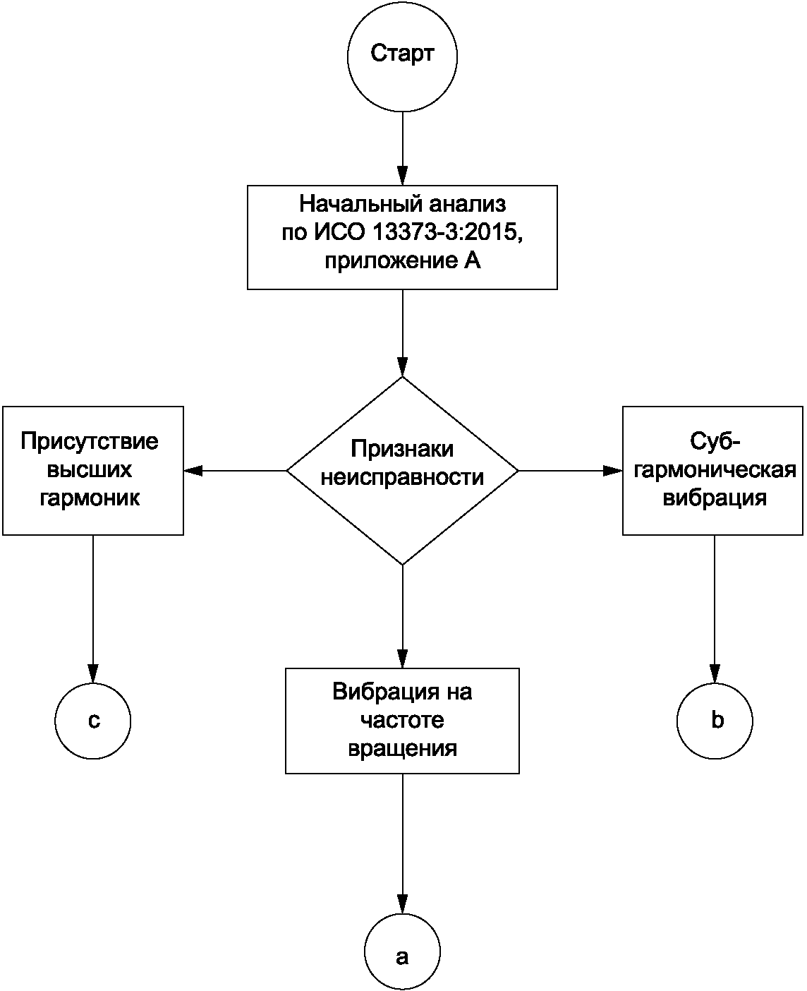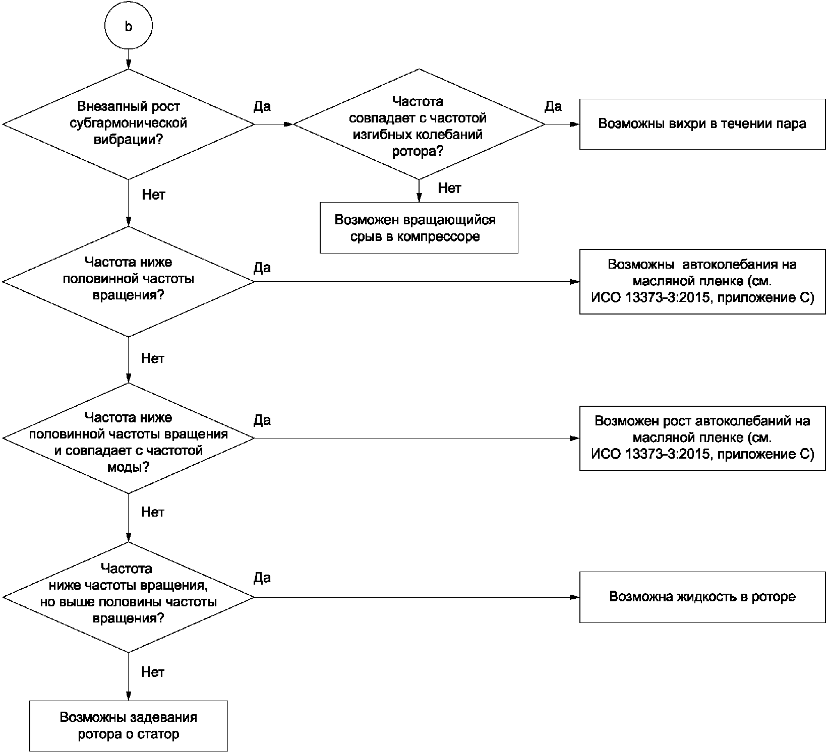 рисунке B.3, где первым вопросом будет то, насколько внезапным является рост этой вибрации. Далее проверяют, не совпадает ли частота вибрации с первой собственной частотой изгибных колебаний ротора, что в паровой турбине может свидетельствовать о наличии вихрей в потоке пара, а в газовой - о вращающемся срыве потока газа. Если вибрация сосредоточена в области субгармонических частот ниже половины частоты вращения ротора, но не совпадает с субгармониками, то следует рассмотреть возможность автоколебаний на масляной пленке в подшипнике (см. ИСО 13373-3:2015, приложение C), связанного с прецессионным движением вала. При достижении частотой автоколебаний собственной частоты изгибных колебаний ротора происходит быстрый рост вибрации. Следует иметь в виду, что эти явления могут быть связаны с лабиринтными уплотнениями, если гидравлический подшипник не обеспечивает достаточного демпфирования колебаний. Если доминирует составляющая вибрации на частоте выше половины частоты вращения, но ниже ее первой гармоники, то это может быть признаком наличия жидкости в роторе. Причиной появления субгармонических составляющих может быть также задевание ротора о статор, который может по-разному проявляться в спектре вибрации, но обычно на частотах в два, три или четыре раза ниже частоты вращения.